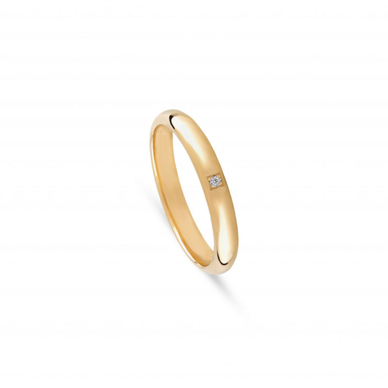 Aliança Romantis Golden Pureness, em ouro amarelo com zircónia, disponível em Ouro 19.2k ou Ouro 9k. Com 3mm de largura e uma espessura aproximada de 1.8mm, meia cana baixa, amendoada por dentro e por fora, esta aliança destaca-se pela sua elegância intemporal, perfeita para um visual clássico e requintado.