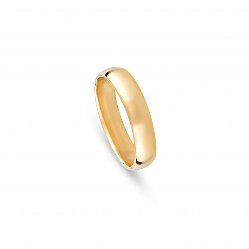Aliança Romantis Golden Pureness, em ouro amarelo, disponível em Ouro 19.2k ou Ouro 9k. Com 4.5mm de largura e uma espessura aproximada de 1.4mm, meia cana baixa, amendoada por dentro e por fora, esta aliança destaca-se pela sua elegância intemporal, perfeita para um visual clássico e requintado.