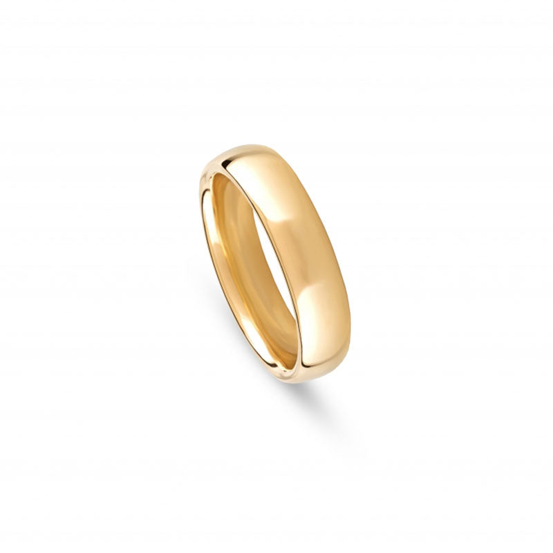 Aliança Romantis Golden Pureness, em ouro amarelo, disponível em Ouro 19.2k ou Ouro 9k. Com 5mm de largura e uma espessura aproximada de 1.7mm, meia cana baixa, amendoada por dentro e por fora, esta aliança destaca-se pela sua elegância intemporal, perfeita para um visual clássico e requintado.