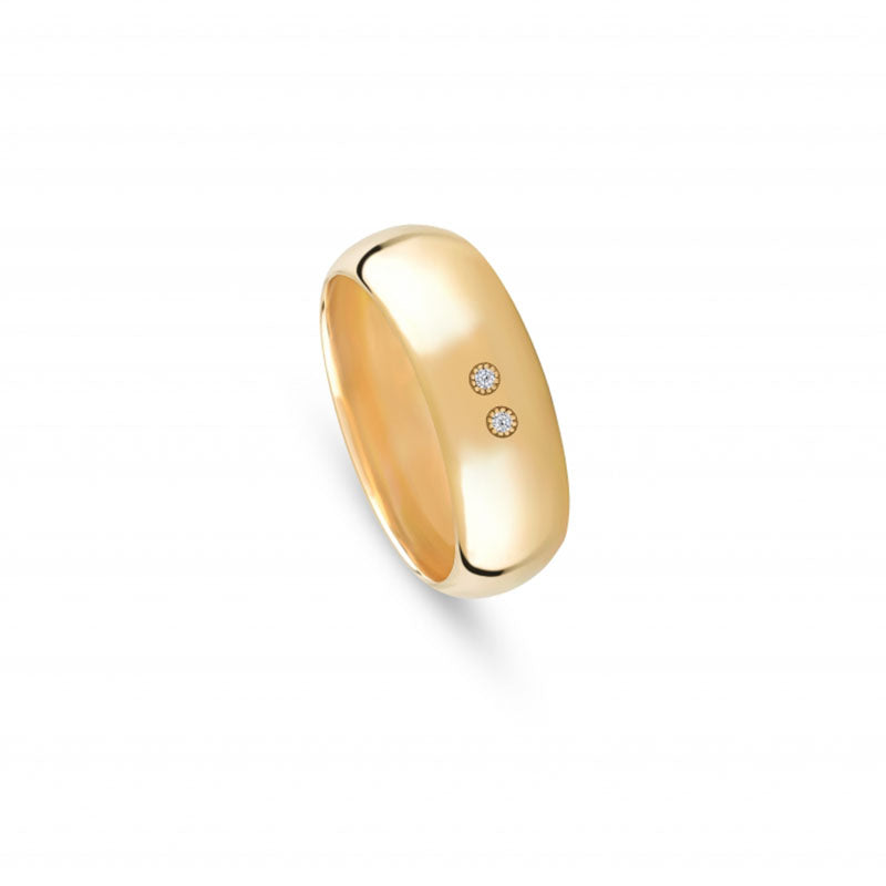 Aliança Romantis Golden Pureness, em ouro amarelo com 2 zircónias cravadas lado a lado em 2 formas circulares.Disponível em Ouro 19.2k ou Ouro 9k. Com 7mm de largura e uma espessura aproximada de 1.9mm, meia cana baixa, amendoada por dentro e por fora, esta aliança destaca-se pela sua elegância intemporal, perfeita para um visual clássico e requintado.