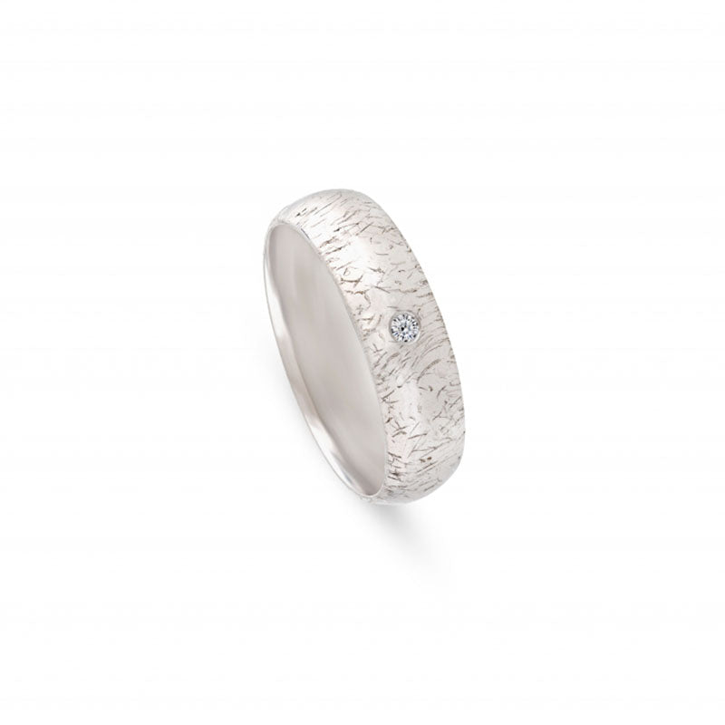 Aliança Romantis White Pureness, em ouro branco riscado com diamante, disponível em Ouro 19.2k ou Ouro 9k. Com 5.5mm de largura e uma espessura aproximada de 1.4mm, meia cana baixa, amendoada por dentro e por fora, esta aliança destaca-se pela sua elegância intemporal, perfeita para um visual clássico e requintado.