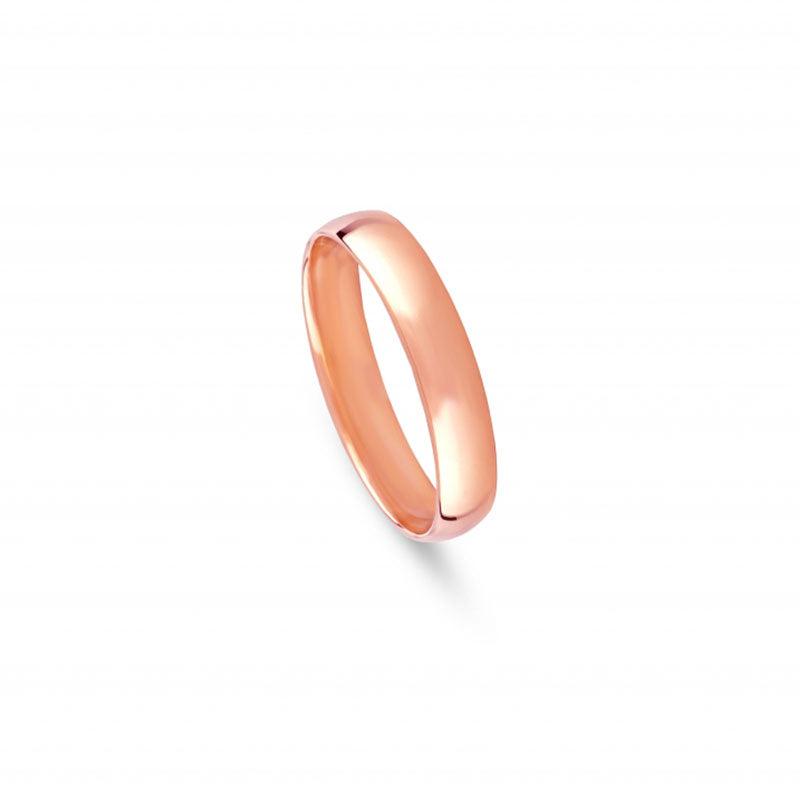 Aliança Romantis Golden Rose, em ouro rosa, disponível em Ouro 19.2k ou Ouro 9k. Com 3.5mm de largura e uma espessura aproximada de 1mm, meia cana baixa, amendoada por dentro e por fora, esta aliança destaca-se pela sua elegância intemporal, perfeita para um visual clássico e requintado.