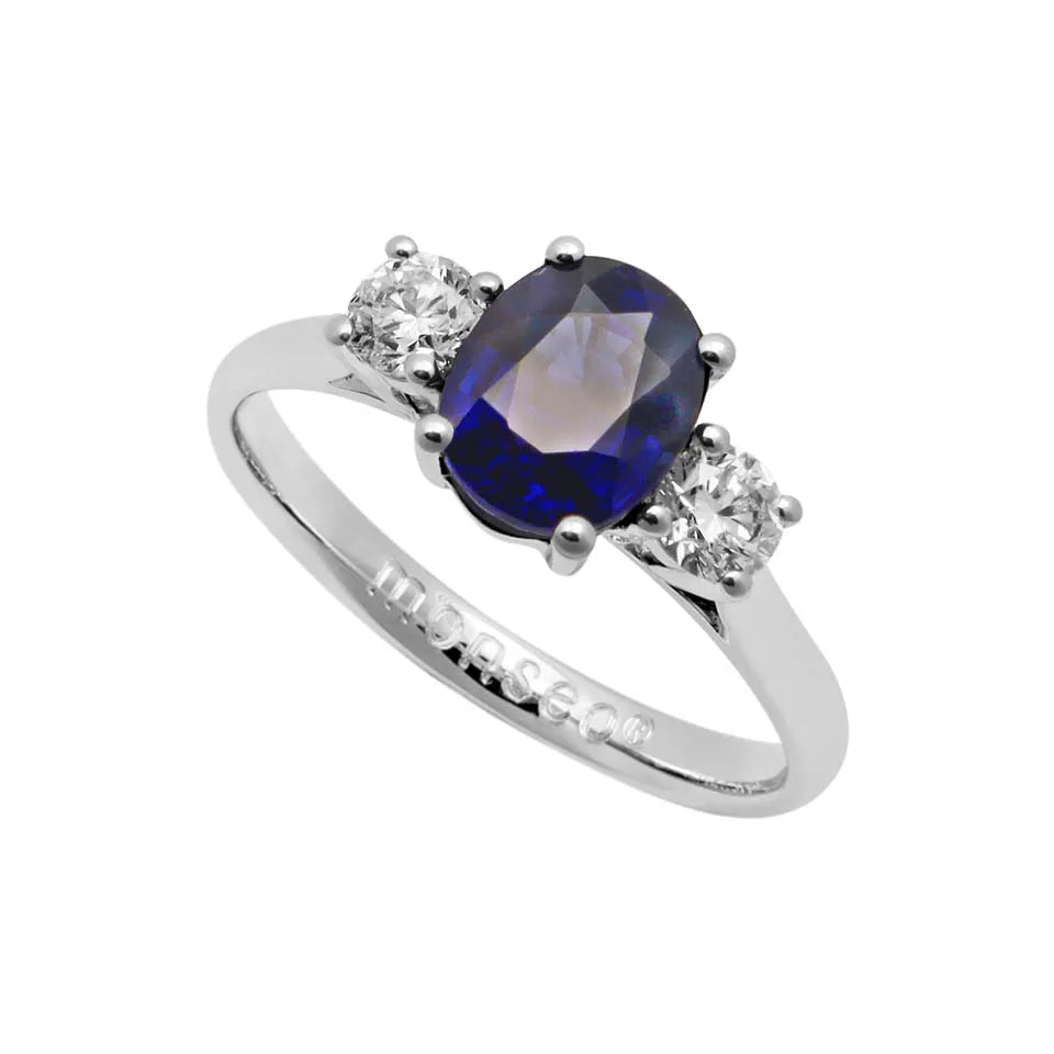 Anel Eternal: Anel em ouro branco 19.2K com 2 diamantes lapidação brilhante com 0.38 ct. e 1 safira oval Sri Lanka 7.92 x 5.58 mm com 1.56 ct. A safira central é acompanhada por relatório gemológico GFCO. Diamantes: Cor G- Pureza VVS. Referência: AN2653A Peso: 2.7 g