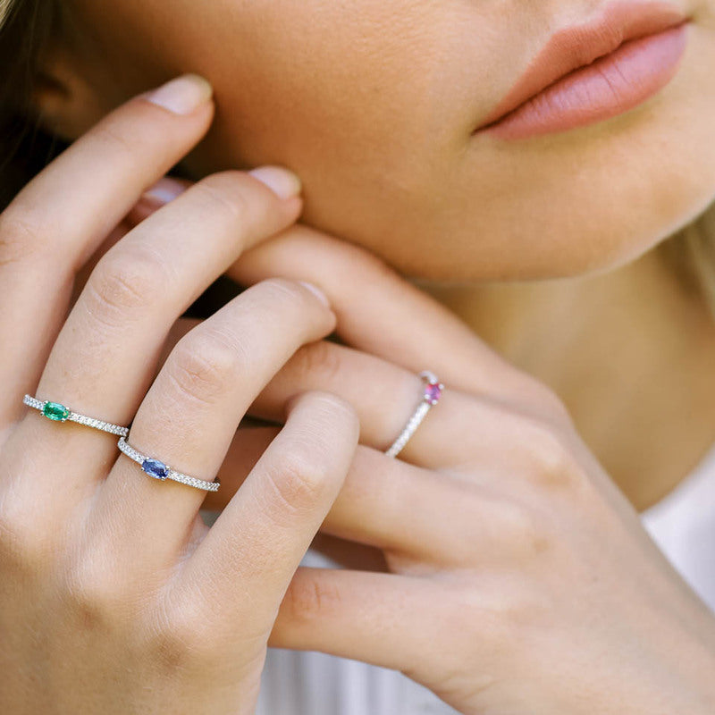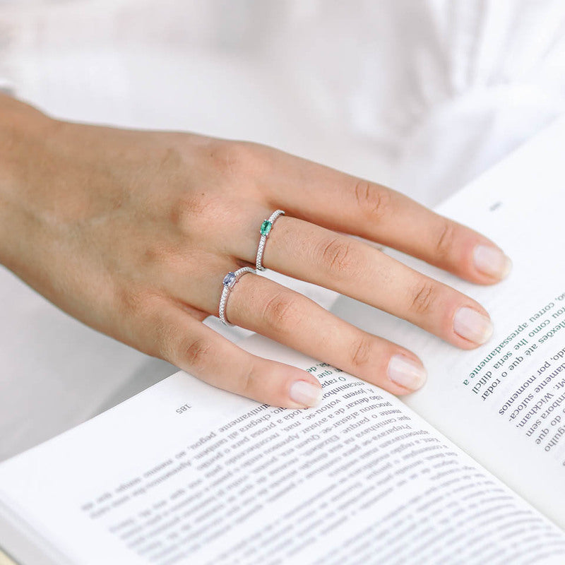 Anel Eternal: Anel em ouro branco 19.2K com 20 diamantes lapidação brilhante com 0.15 ct. e 1 esmeralda oval com 0.22 ct. Diamantes: Cor G- Pureza VVS. Referência: AN2387D Peso: 2 g