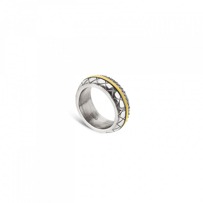 O anel da coleção Delight combina numa só peça todos os principais elementos desta coleção: mixed metals e mixed textures. Um anel em banda com um design mais "bold" que pode perfeitamente ser utilizado de forma individual para ganhar ainda mais destaque. É maioritariamente prateado, com um elemento dourado central em todo o seu torno que separa um lado totalmente cravado com cristais brancos de outro com um padrão geométrico característico da coleção.