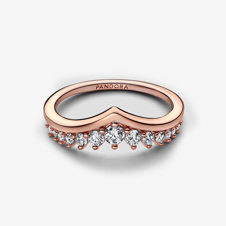 Deixe o passado inspirar o seu estilo com este Anel Anel Timeless Wish Floating Pavé, uma interpretação moderna dos estilos clássicos de anéis. Em prata com revestimento de ouro rosa 14k, o aro do anel brilha com uma fila de pavé por baixo do arco do osso da sorte, com o tamanho certo para criar um apontamento brilhante para qualquer conjunto. Use-o como uma peça única ou sobreponha com anéis mais brilhantes Pandora Timeless para uma abordagem moderna a sobreposições que nunca sai de moda.