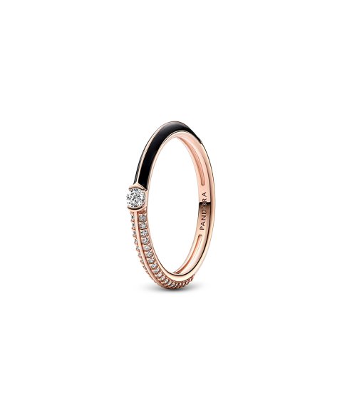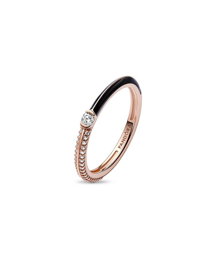 Acrescenta brilho e profundidade ao teu conjunto, com o nosso Anel Pandora ME Pavé & Black. Uma zircónia de corte brilhante assenta entre uma fila de pavé cintilante e esmalte preto aplicado à mão num aro revestido a ouro rosa 14k. Joga com os contrastes e conjuga-o com outros anéis Pandora ME, para um conjunto muito teu.