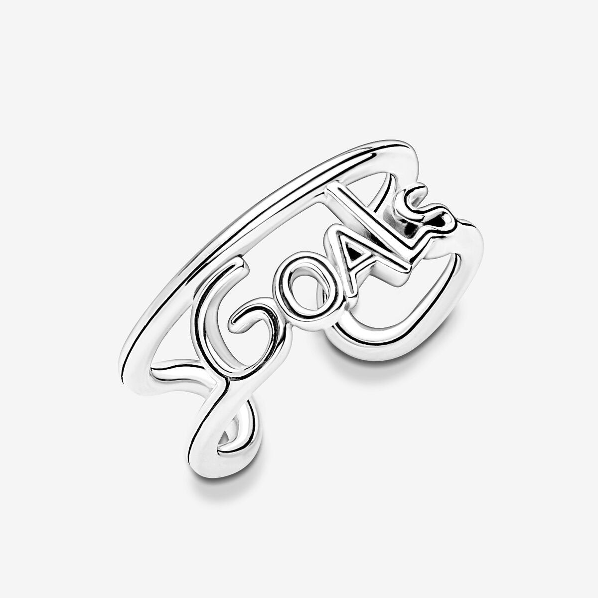 A peça que celebra todas as tuas metas. Esta peça marcante em prata apresenta a palavra "Goals" num design de linha contínua que conduz ao aro do anel. Usa a tua para te lembrares de acreditar em ti mesma e alcançares todas as tuas metas. Nota: a tentativa de alterar o aro aberto danificará o teu anel.