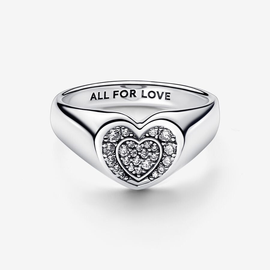 Transmita a energia vibrante do amor com o nosso Anel Signet Radiant Heart. Este anel apresenta um design de coração côncavo multidimensional, acentuado com pavé cintilante e acabamento manual em prata. "ALL FOR LOVE" está gravado no interior do aro, para se recordar do poder de dois corações unidos.