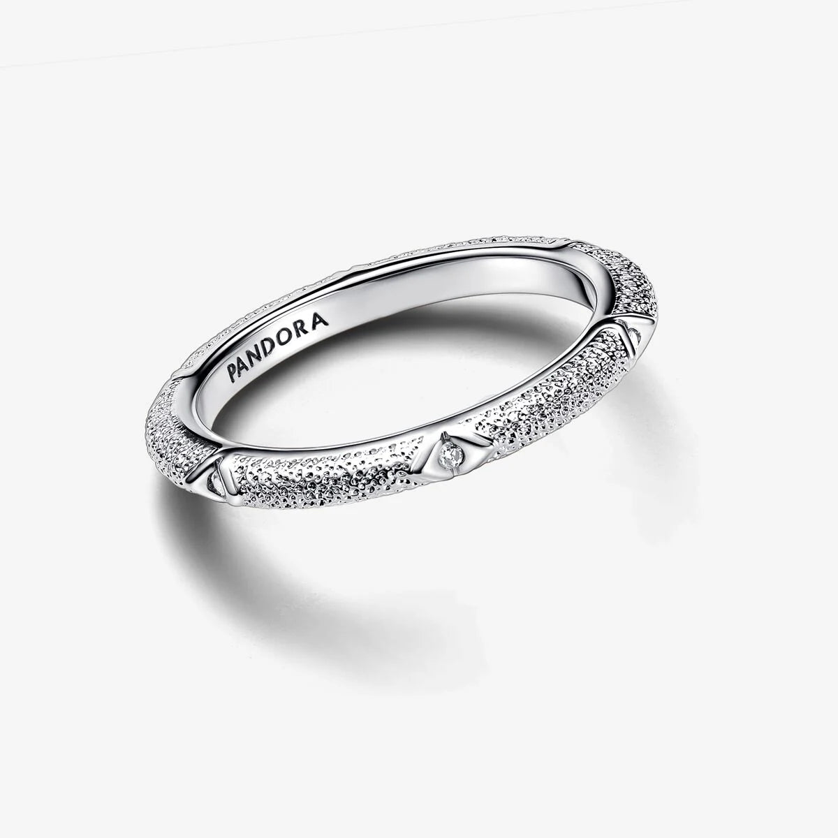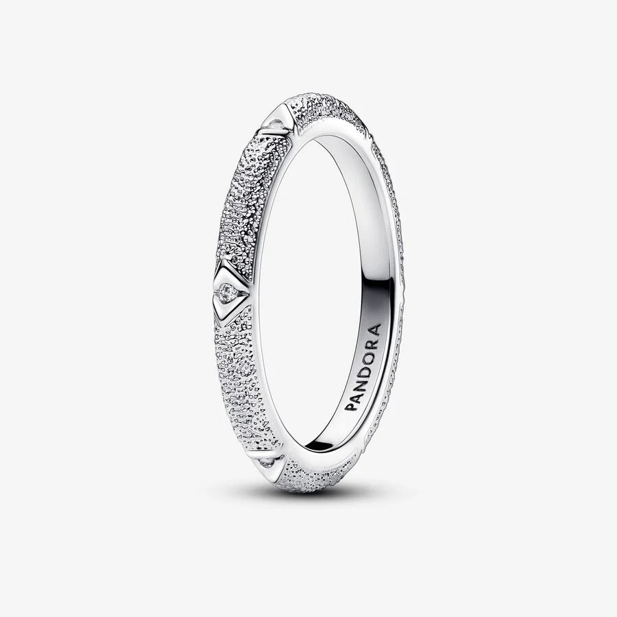 Está tudo nos detalhes com o Anel Pandora ME Texture & Stones. Um aro de prata com perfil em forma de D é pontuado por seis pontos triangulares, cada um com uma pedra brilhante. O resto do aro do anel é adornado com um padrão texturado. Inspirado na textura da areia e no padrão do sol no oceano, este anel delicado e detalhado é uma forma subtil de se destacar.