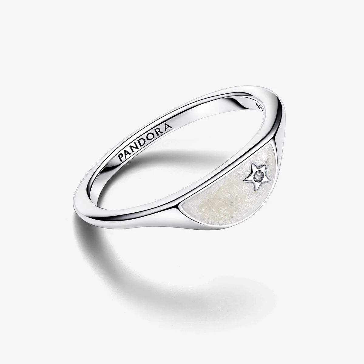 Invoca o poder dos opostos ao usares o Anel Pandora ME Signet esmaltado e estrela. Um anel em prata apresenta um semicírculo com uma estrela elevada - com uma pedra ao centro - rodeada por esmalte branco e bege brilhante. Usa este anel sinete de prata sozinho ou com o Anel Sinete Metade Esmalte Pandora ME, com revestimento em ouro 14k, concebido para conjugar com este anel e colocar as estrelas opostas umas às outras.