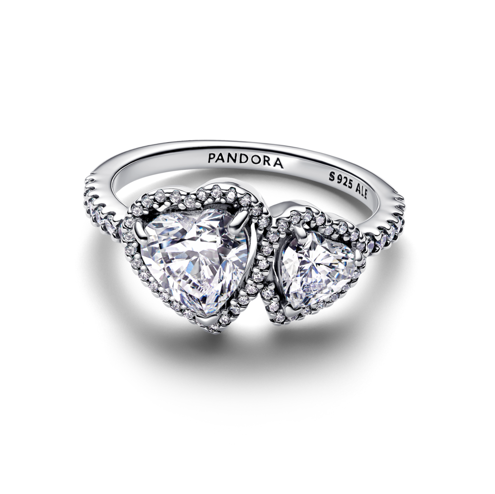 Uma verdadeira declaração de amor, este anel em prata apresenta duas zircónias de corte coração, ligadas por pavé cintilante. Com mais pedras brilhantes no aro, simboliza a harmonia e o apoio entre duas almas. Coleção Pandora Timeless.