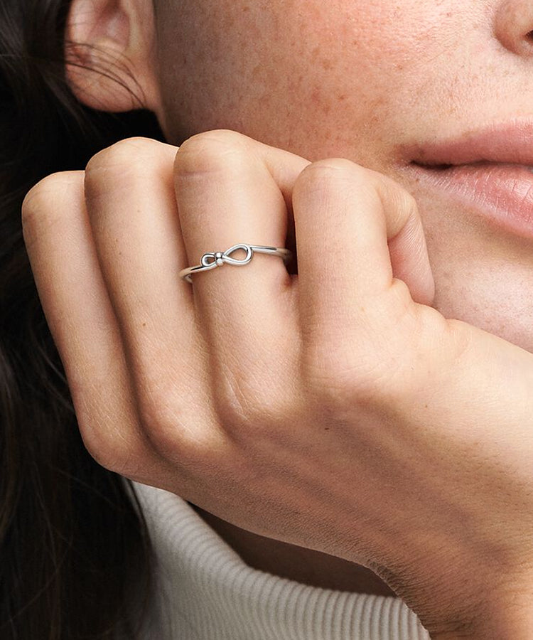 É o dobro do amor com a interpretação única da Pandora do símbolo do infinito. O nó icónico é envolvido à volta do centro moldado assimetricamente, para simbolizar a força da ligação. Este anel delgado infinito, em prata, é a representação perfeita de laço inquebrável e um elemento repleto de estilo para a sua colecção de anéis. Quando o infinito não é suficiente, experimente conjugar este anel com outras peças inspiradas no infinito para amplificar a mensagem e criar um look marcante.