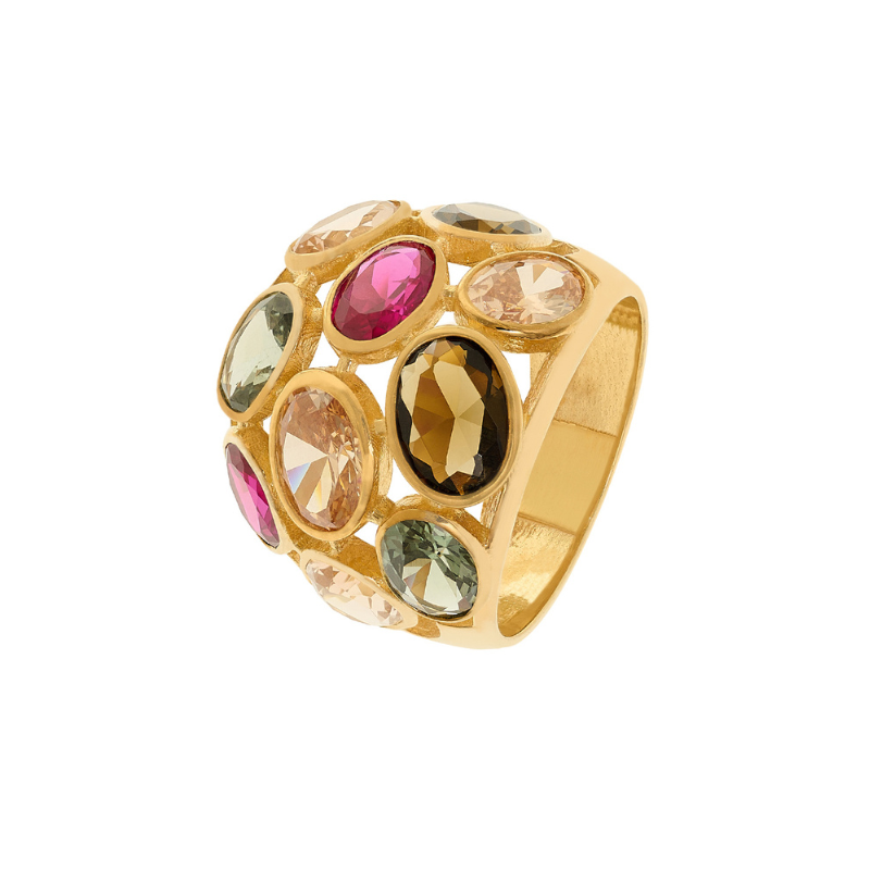 Anel Disco em prata de lei com banho de ouro e quartzos. Inspirada no brilho das noites de celebração no otimismo de um novo ano, a coleção Disco reflete a energia e o glamour das festas! As joias com pedras coloridas, cuidadosamente encastradas, são uma ode à luz, à música e à vibração dos festejos de fim de ano. O design arrojado da coleção mantem, no entanto, leveza e a versatilidade para a acompanhar em qualquer momento especial.