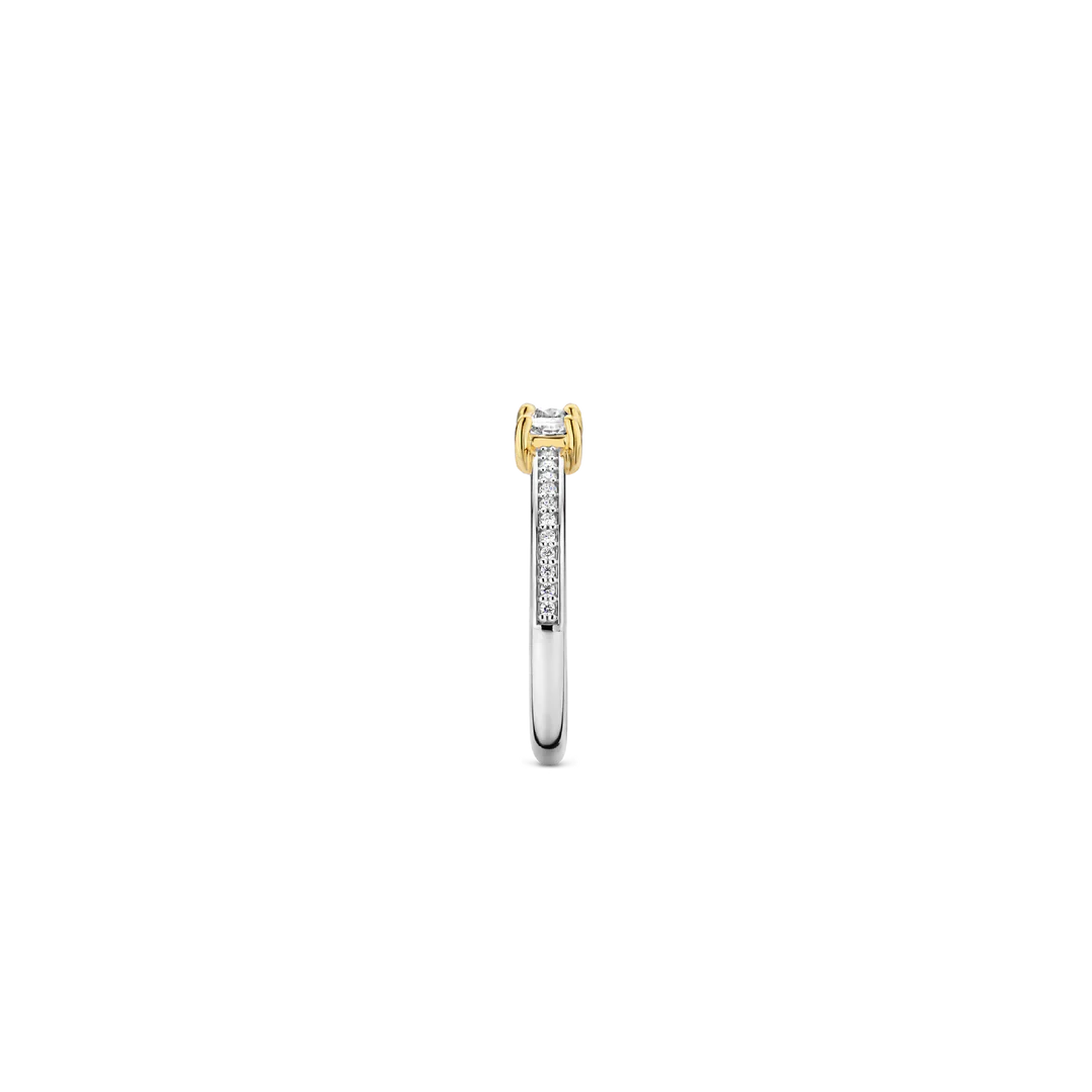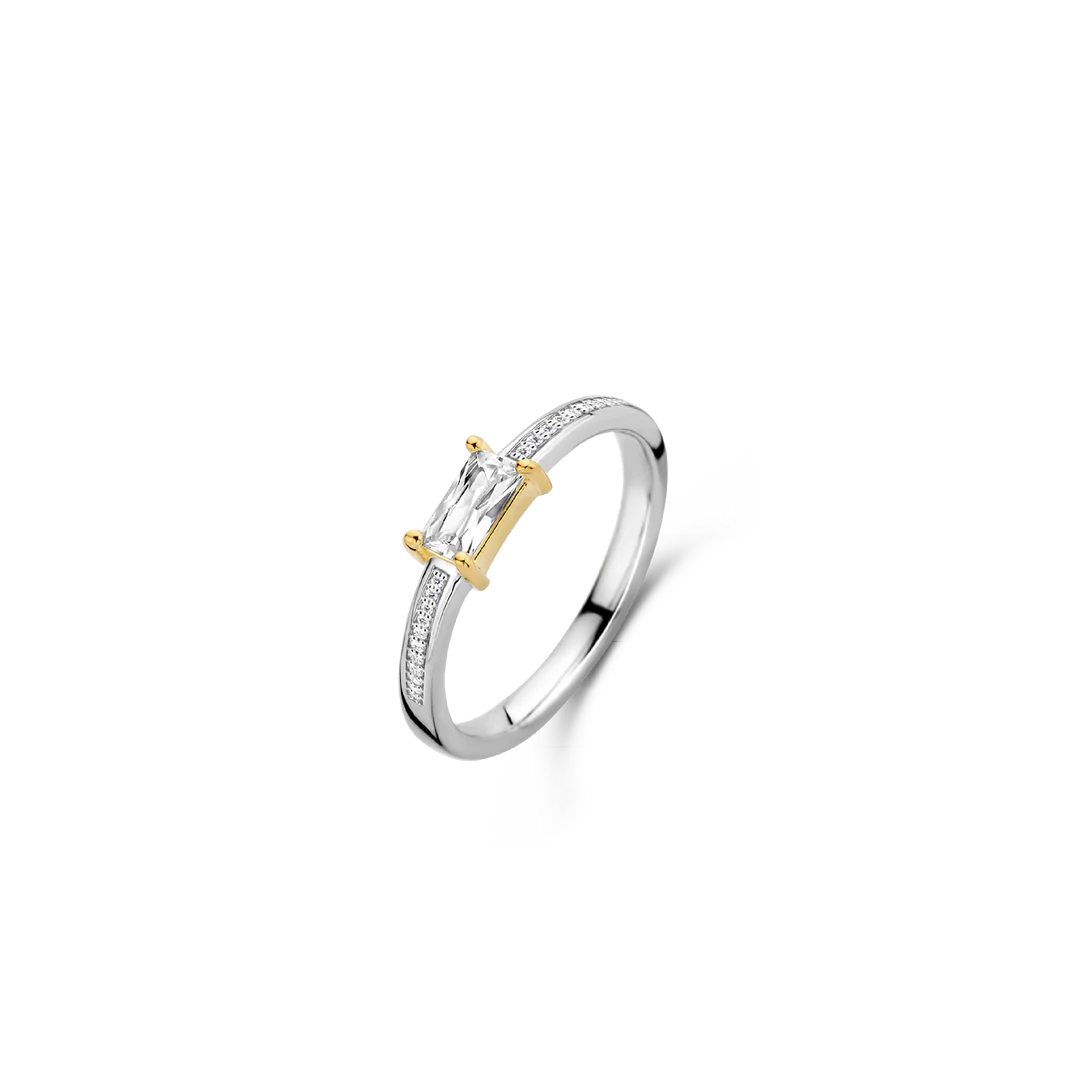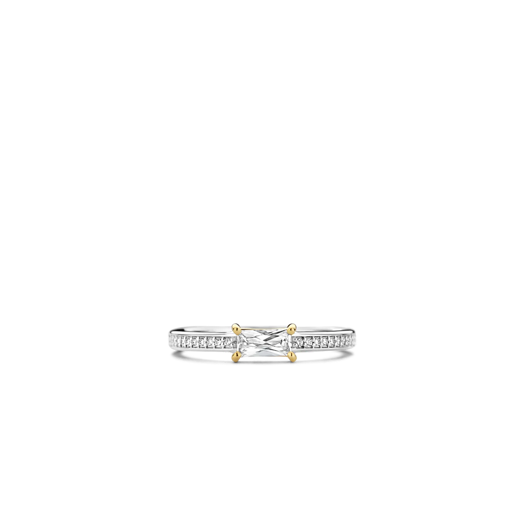 Este anel de prata banhado a ouro TI SENTO 12248ZY ostenta uma pedra de zircônia cúbica de corte baguete envolvida por uma configuração de garra banhada a ouro. Sua haste é decorada por um pavé de pedras de zircônia cúbica branca. O anel é feito de prata esterlina 925. Esta peça luxuosa e atemporal é ideal para empilhar com outras ou ser usada sozinha.