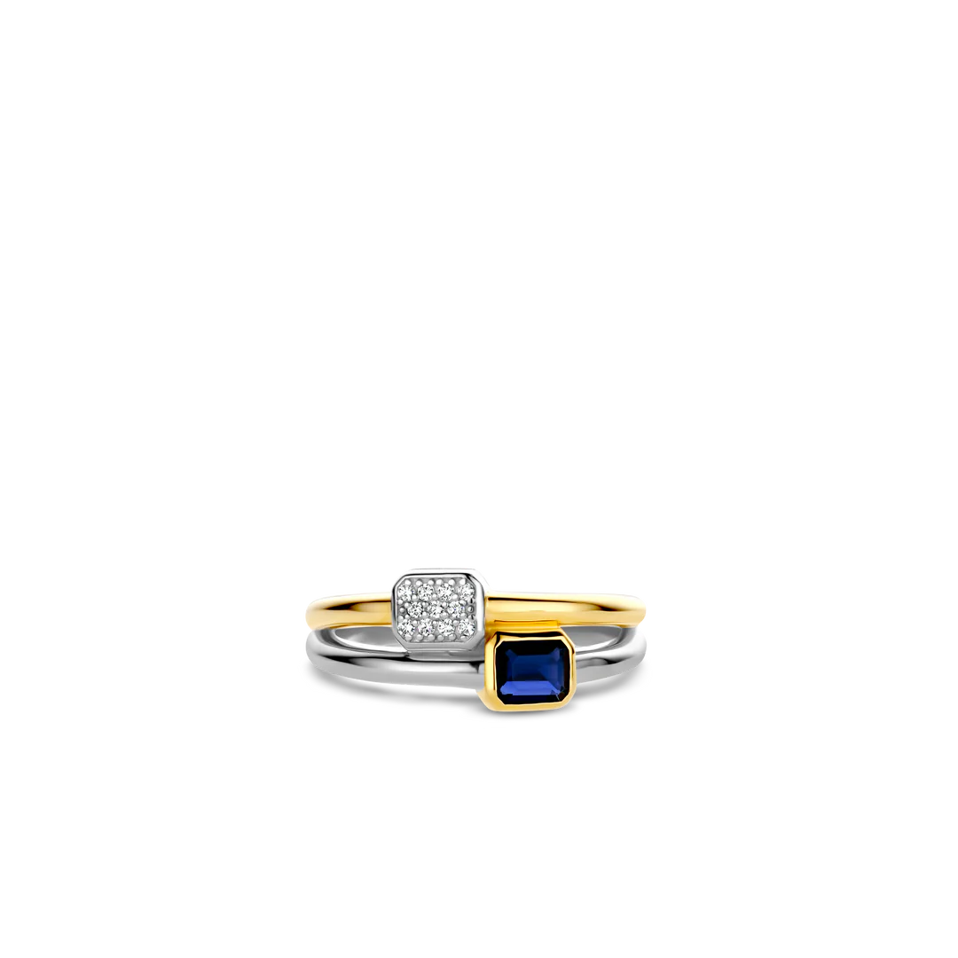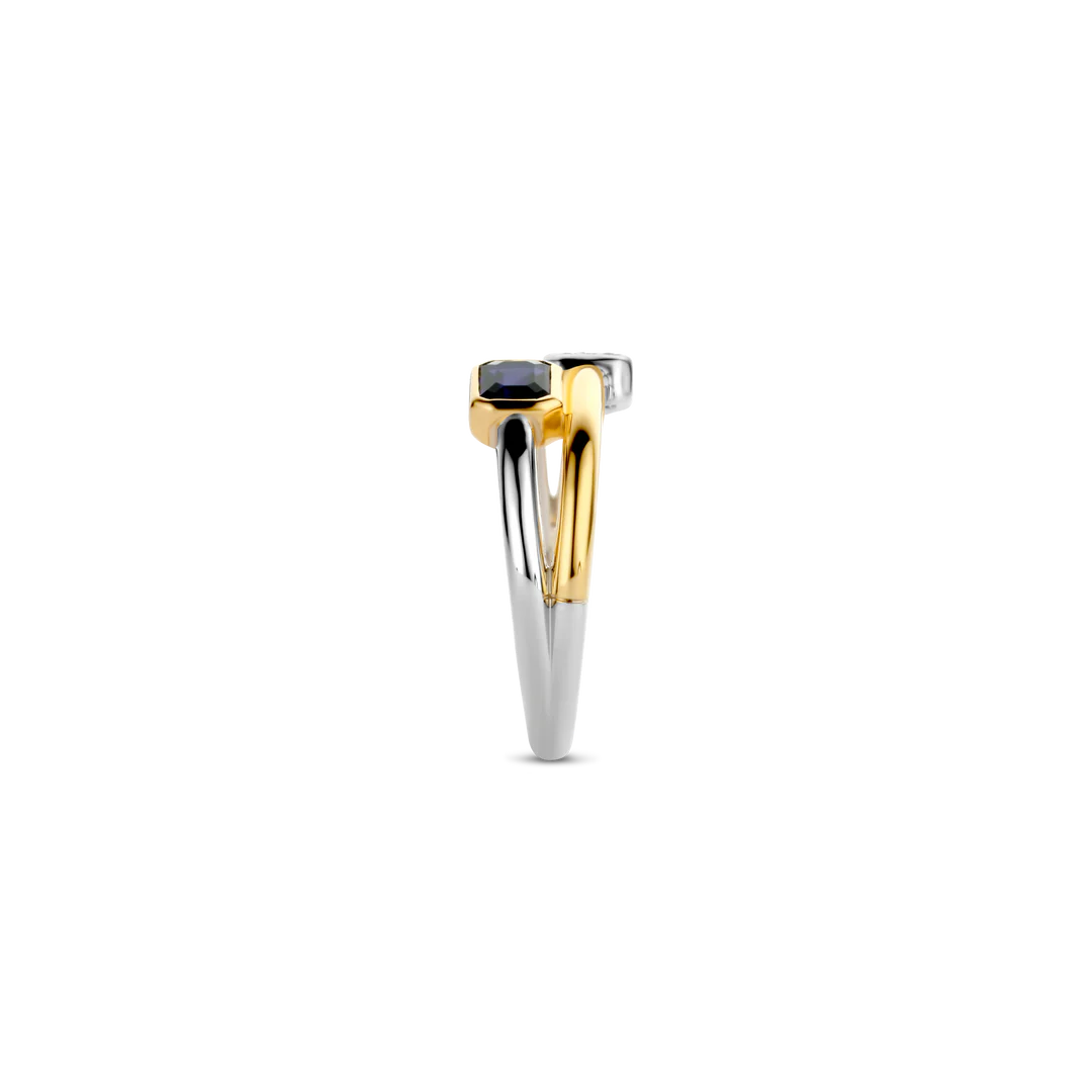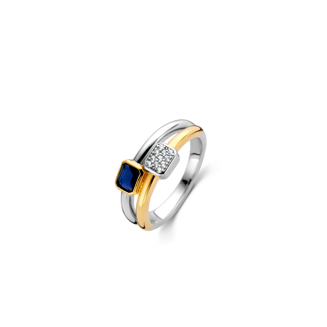 Este anel de prata banhado a ouro TI SENTO 12275BY apresenta dois anéis misturados em um. Um dos anéis tem uma pedra azul escura engastada em uma configuração banhada a ouro e o outro apresenta um pavé de pedras de zircônia cúbica branca. O anel é feito de prata esterlina 925 e revestido com uma espessa camada de platina para protegê-lo e mantê-lo luminoso. Uma das faixas é banhada a ouro amarelo.