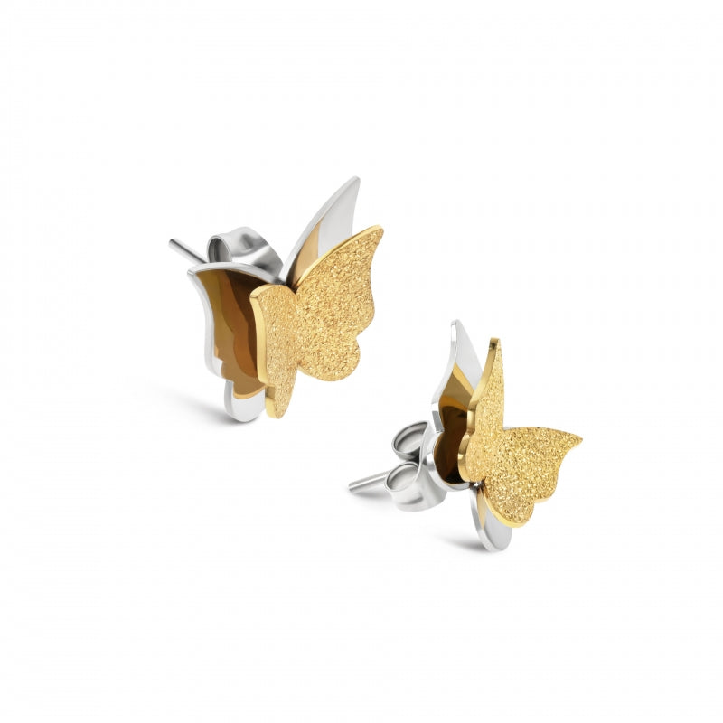 Os brincos Duo da coleção Butterfly são pequenos e combinam de forma muito subtil dourado e prateado. São compostos por duas camadas da mesma forma mais realista de uma borboleta, uma frontal mais pequena em dourado e com um toque extra de brilho e outra, ligeiramente maior, em prateado - dando o efeito de uma moldura na forma de borboleta. Os brincos são de espigão e terminam com um fecho em borboleta para maior conforto. Esta coleção One capta a beleza efémera das borboletas, uma fusão entre delicadeza e poder da Natureza.