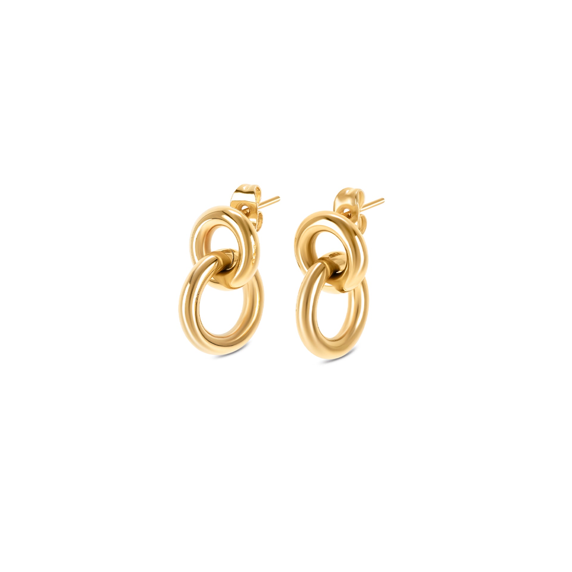 Os brincos Circle da coleção Luminous são pequeno e semi-bold. Duas argolas douradas, de textura lisa, com diferentes tamanhos e entrelaçadas entre si o que confere aos brincos um aspecto tridimensional. Para quem gosta de looks mais matchy match, o colar Circle desta coleção é o par ideal para os brincos. São brincos de espigão e terminam com um fecho em borboleta.