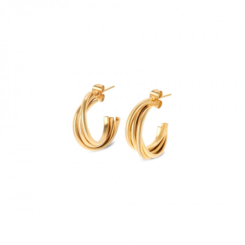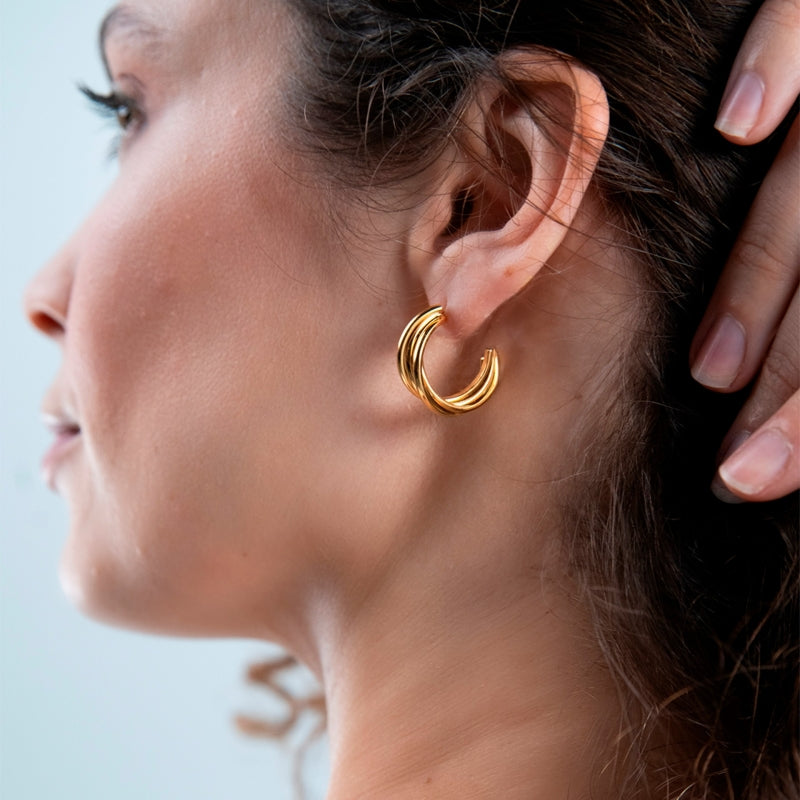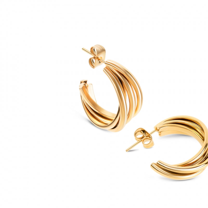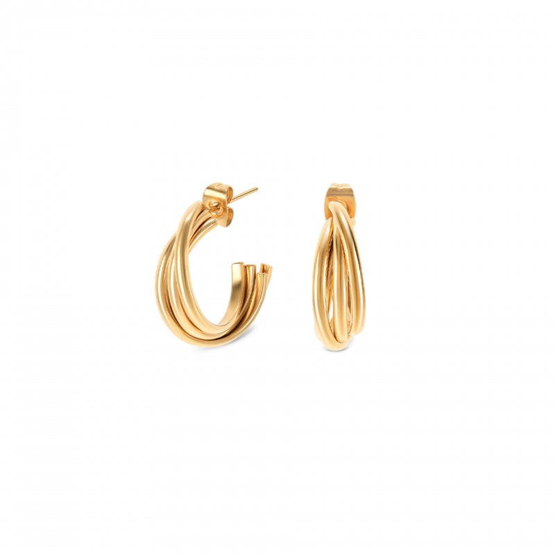 Os brincos Solid da coleção Luminous são integralmente dourados e têm um twist (literal) no seu padrão. Umas argolas (half-hoops) de tamanho pequeno compostas por três tiras arredondadas entrelaçadas e unidas entre si desde o espigão até a sua terminação. O fecho dos brincos é em borboleta.