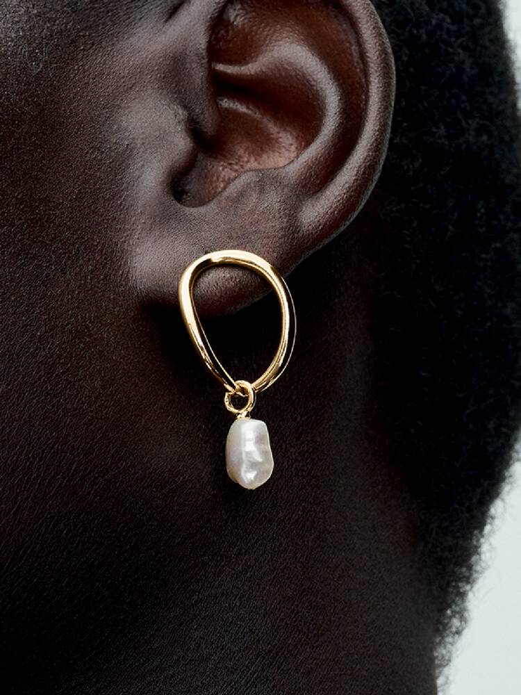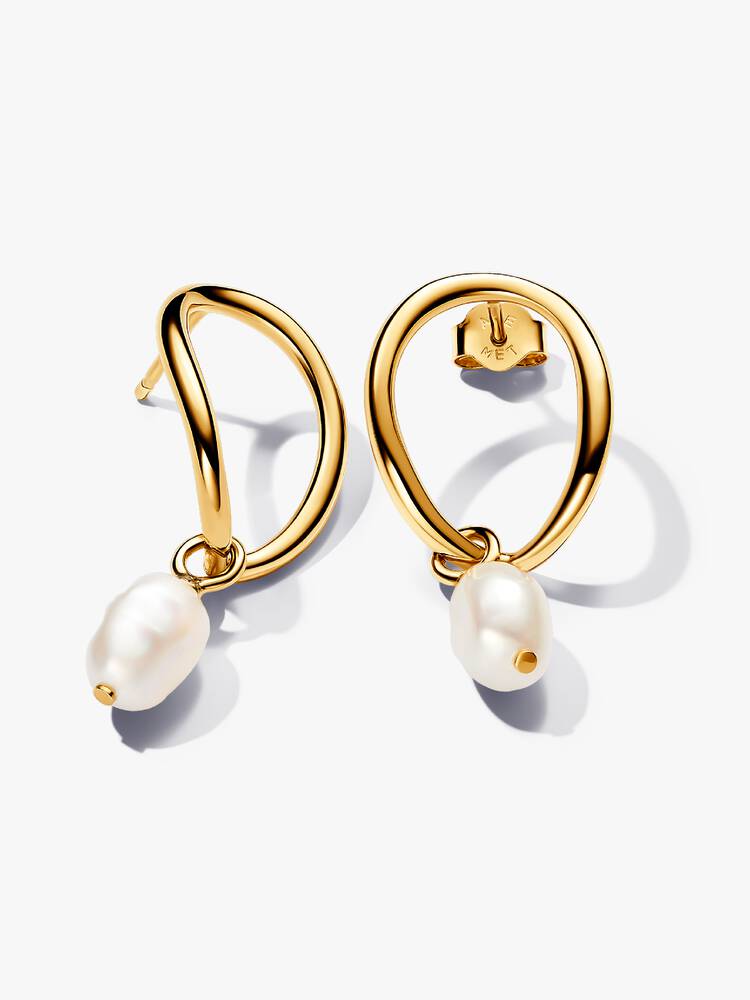 Apresentamos um tipo diferente de clássico. Cada brinco apresenta uma pérola de cultura barroca, pendendo de um oval ligeiramente ondulado, com revestimento em ouro 14k. Linhas e arestas suaves combinam-se nesta expressão contemporânea de um estilo intemporal.