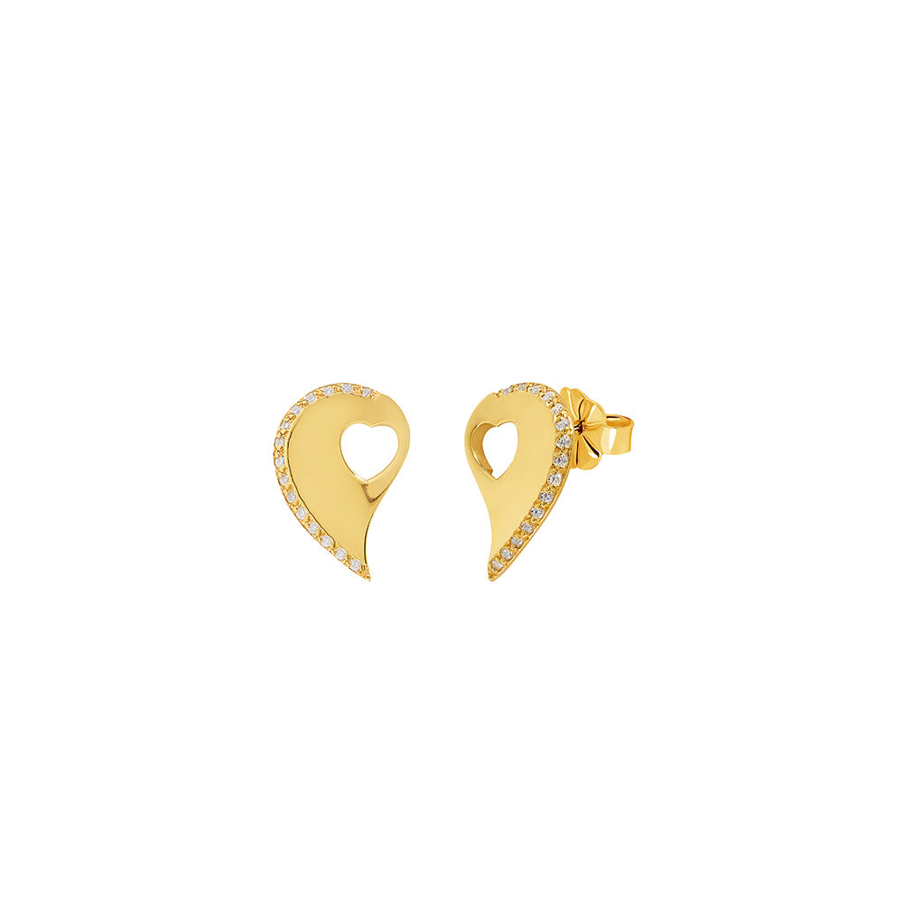 Complemente o seu look com estes brincos femininos da Eugénio Campos Afinidade, elaboradas em prata de lei 925 com um acabamento de um banho dourado em ouro. Com um design minimalista de duas metades da forma corações, a joia evoca um brilho refinado com as suas zircónias cravadas à volta da peça.