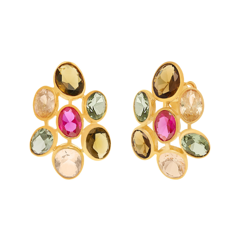 Brincos Disco em prata de lei com banho de ouro e quartzos. Inspirada no brilho das noites de celebração no otimismo de um novo ano, a coleção Disco reflete a energia e o glamour das festas! As joias com pedras coloridas, cuidadosamente encastradas, são uma ode à luz, à música e à vibração dos festejos de fim de ano. O design arrojado da coleção mantem, no entanto, leveza e a versatilidade para a acompanhar em qualquer momento especial.