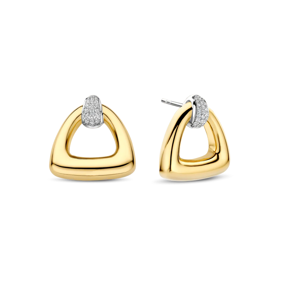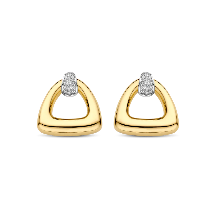 Deixe-se levar pelo luxo e pela sofisticação com os brincos bicolor TI SENTO 78034ZY em prata. Confeccionados em prata de lei 925, os brincos esculturais em formato de triângulo aberto são banhados em um radiante tom de ouro amarelo, com suas curvas arrojadas polidas até um brilho espelhado. No ápice, uma tampa banhada a platina cravejada com zircônias cúbicas brancas de lapidação brilhante adiciona um toque refinado e um contraste elegante ao tom quente do ouro.