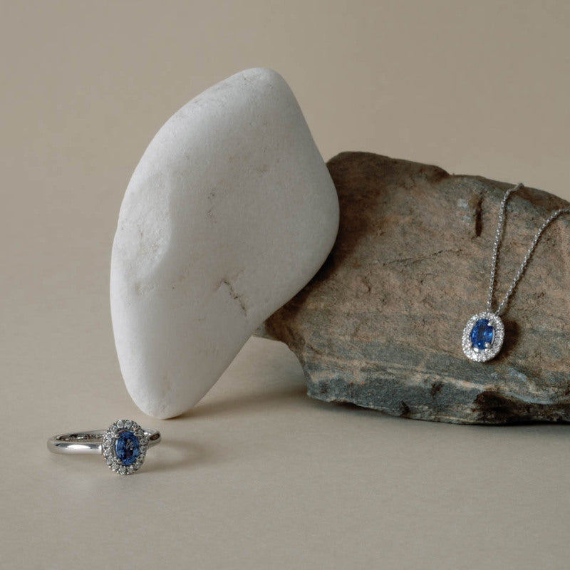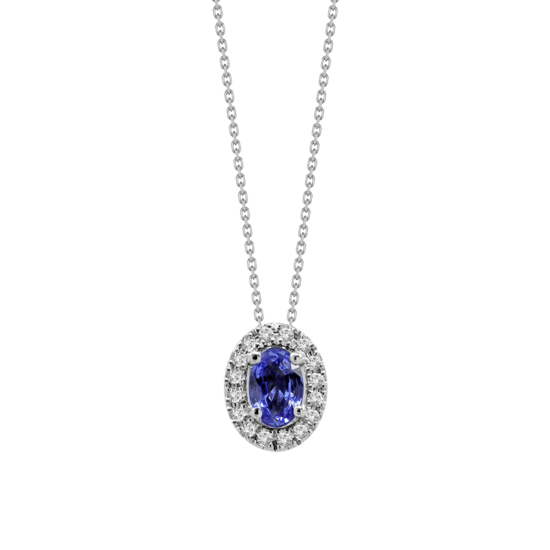 Colar Moments: Colar em ouro branco 19.2K com 16 diamantes lapidação brilhante com 0.12 ct. e 1 safira oval Ceilão com 0.68 ct. Diamantes: Cor G- Pureza VVS. Referência: CO2643 Peso: 3.1 g Colar com fio de ouro de 19.2 K, comprimento 45 cm ajustável a 42 cm. Diâmetro do centro do colar: 10 x 8 mm.