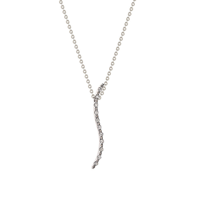 Artigo: Colar Marca: Romantis Colecção: Unique Moments Metal/Toque: Ouro 19.2k Pedras: Diamantes Cor/Metal: Branco Peso apx.*: 2.1g(Ouro 19.2k) Comprimento: 42.00000mm Descritivo Pedras: Qtd Tipo Peso (ct) Tam. Cor / Qual. 11 Diamantes 0.11 1.25mm H-VS Acabamento:Polido * Valores indicativos. Sujeito a variação produção (+/- 5%)