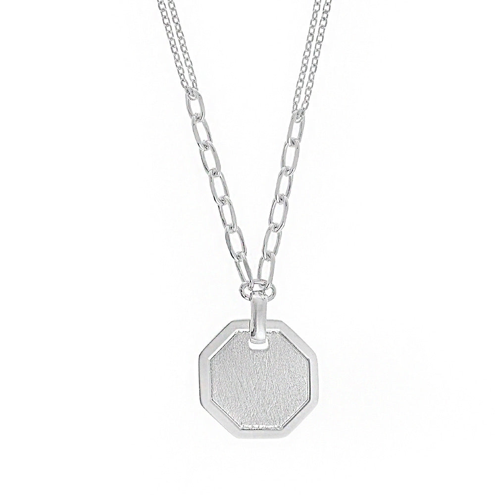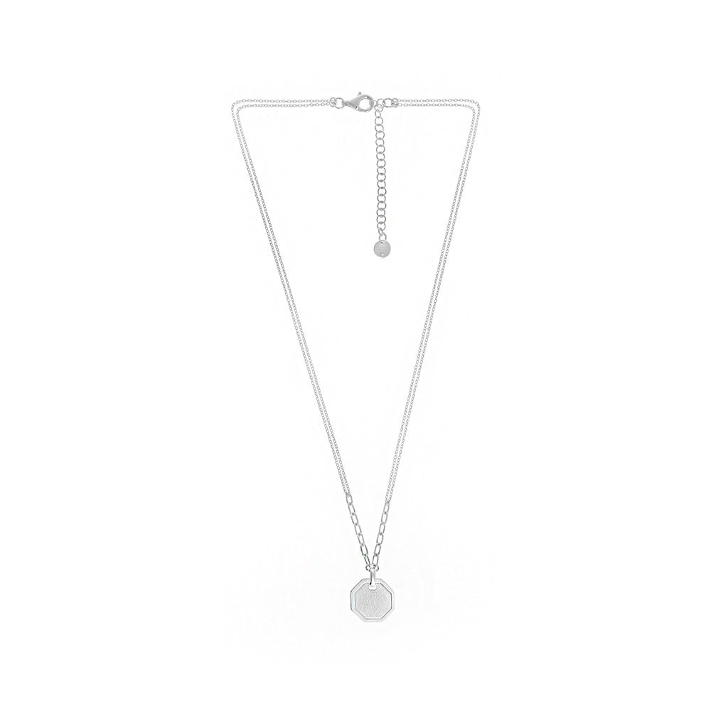 Colar Poesia em prata de lei banhado a ródio, com medalha de hexágono, acabamento acetinado e design com duas malhas diferentes. Grave momentos inesquecíveis da sua história numa joia. Possibilidade gravar frente, verso, ou ambos