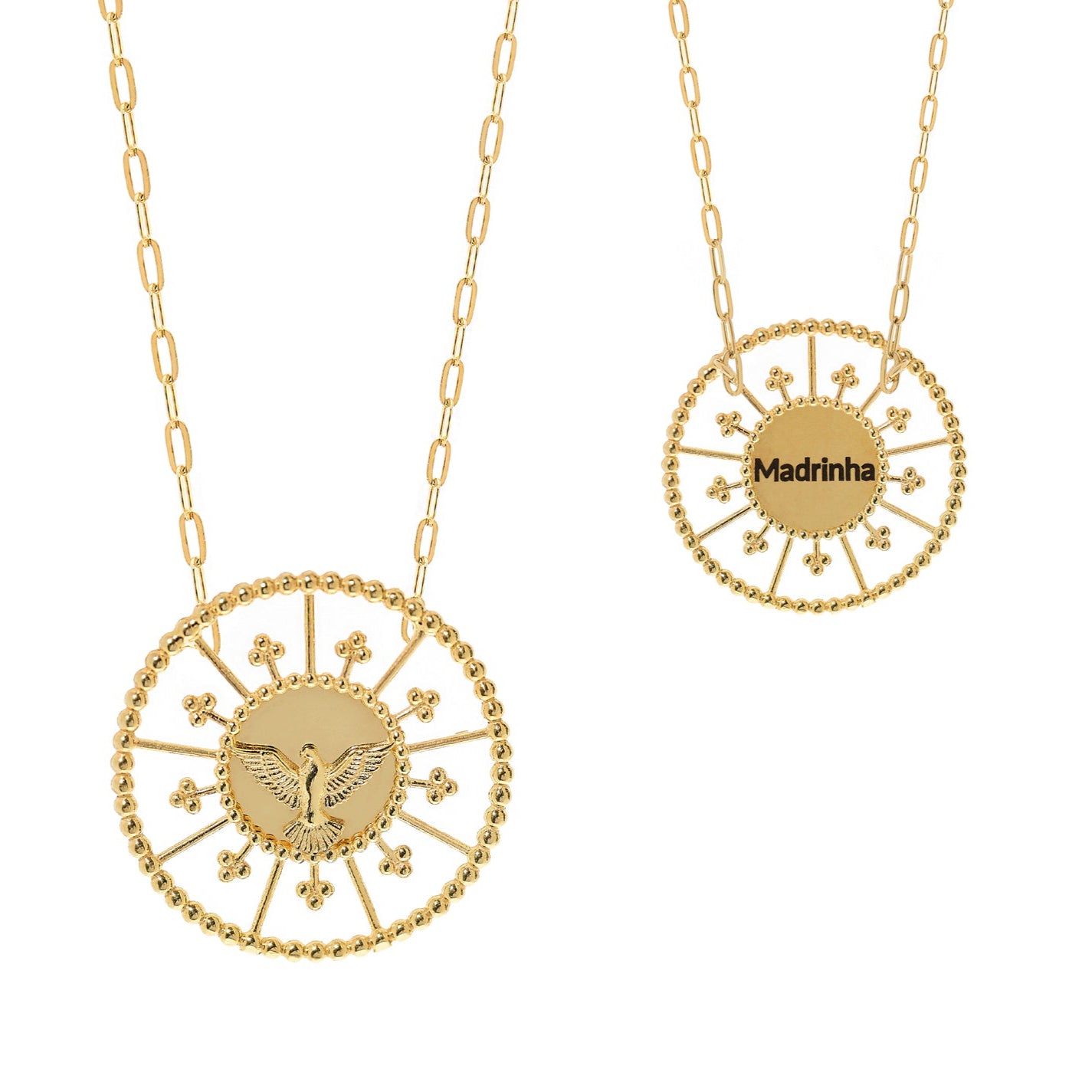 Um elegante colar de mulher em prata de lei 925 da Eugénio Campos, banhado a ouro amarelo, ideal para presentear à sua madrinha. Desenhada com uma malha fina, esta joia carrega um belo amuleto circular habilmente detalhado com uma pomba no centro e a inscrição, na traseira, Madrinha.