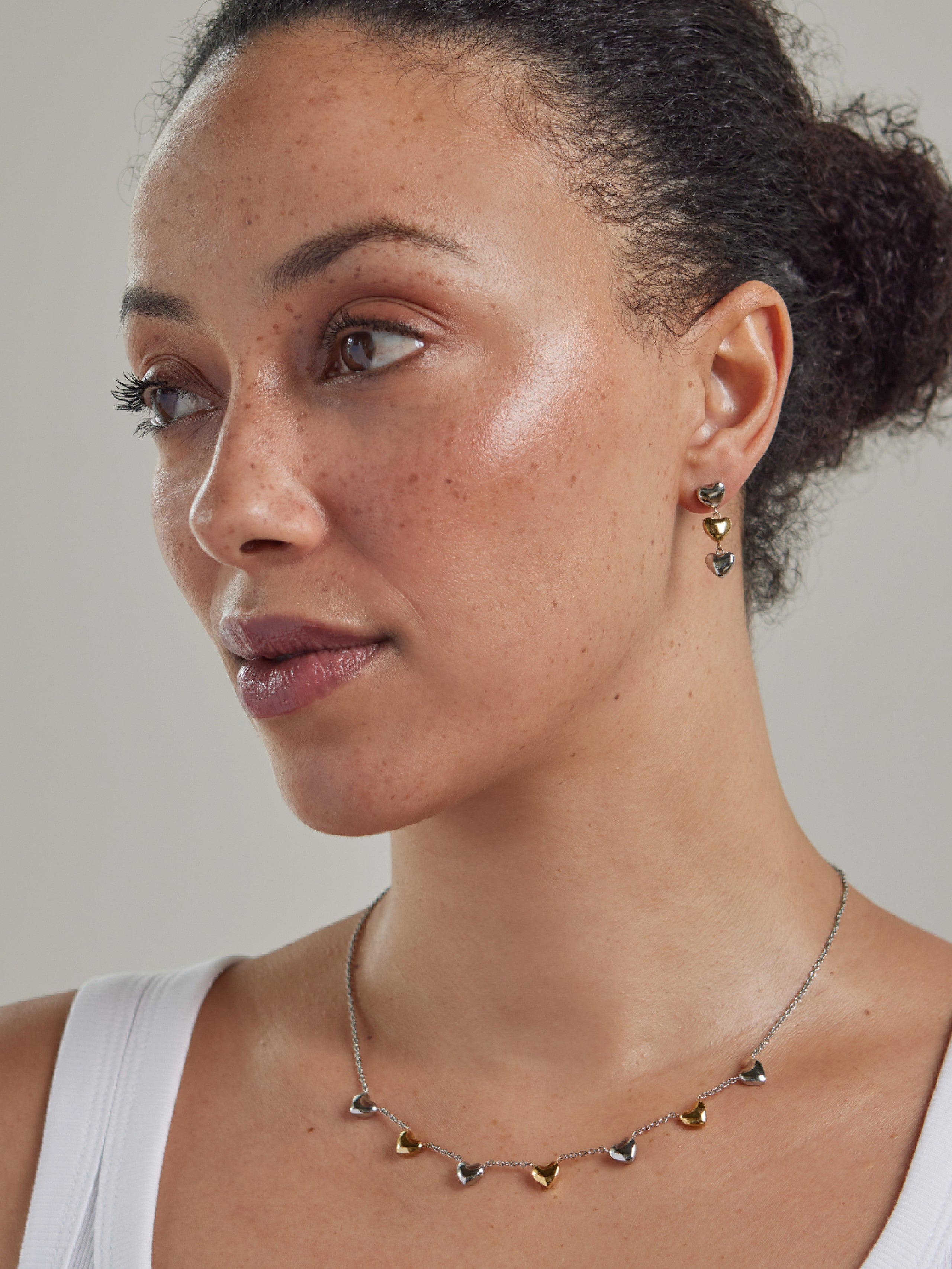 A pulseira Embrace da coleção Crazy Heart é composta por uma malha fina prateada e 5 corações de cores diferentes, prateado e dourado. O colar Embrace Bicolor da coleção Crazy Heart é composto por uma malha fina prateada e 7 corações de cores diferentes, prateado e dourado. Termina com um fecho em mosquetão e com um pequeno extensor tornando o colar mais versátil para ser utilizado com diferentes comprimentos. Os pequenos corações que compõem todas as peças da coleção representam o amor e a paixão, tornando a Crazy Heart a escolha ideal para presentear aquela pessoa especial na sua vida.