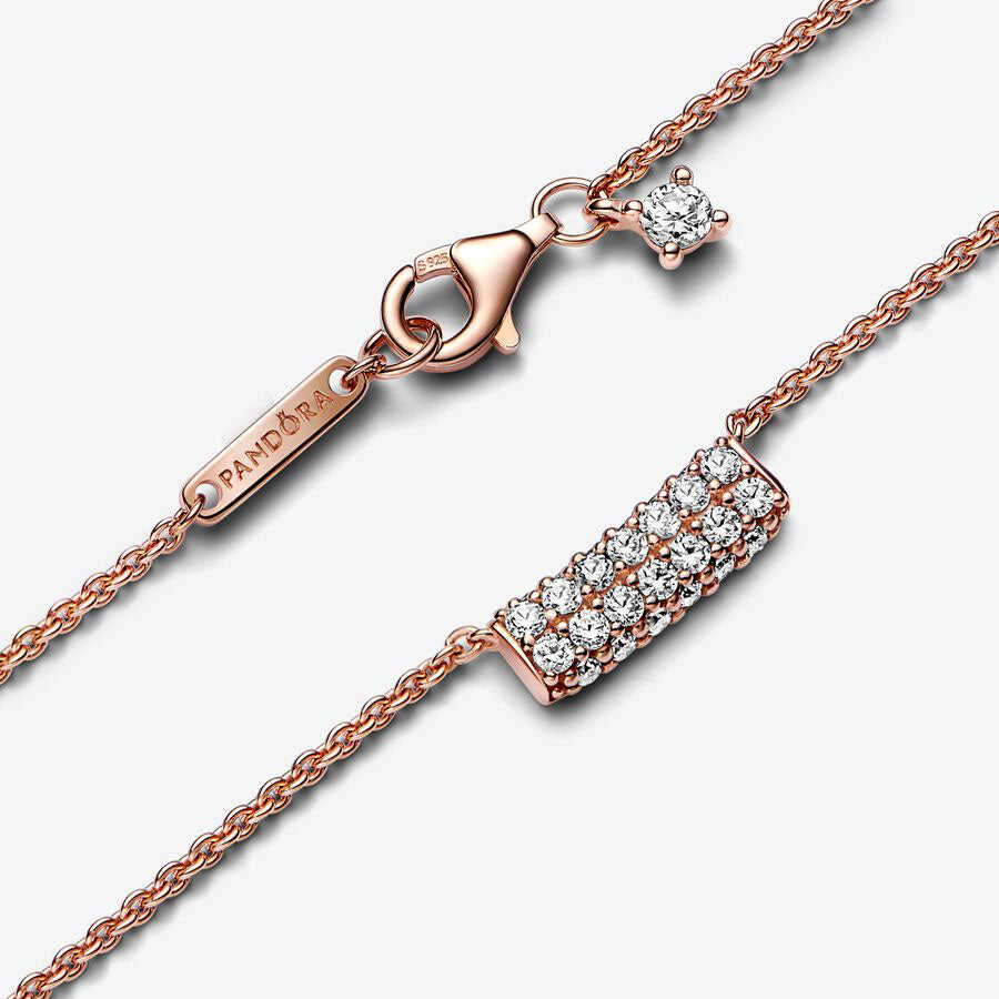 Maximize o seu potencial de brilho com o Colar Pandora Timeless Pavé Duplo. Esta peça versátil apresenta um pendente de barra curva, fixado à corrente com um acabamento geométrico e uma fila única de brilho, realçado com filas extra de pedras viradas para fora de cada lado. Acrescente um apontamento de brilho cálido com o nosso acabamento revestido a ouro 14k que oferece um brilho tridimensional. Ajustável em dois comprimentos, use esta jóia como uma peça marcante por si só ou sobreponha com mais estilos para um look arrojado.