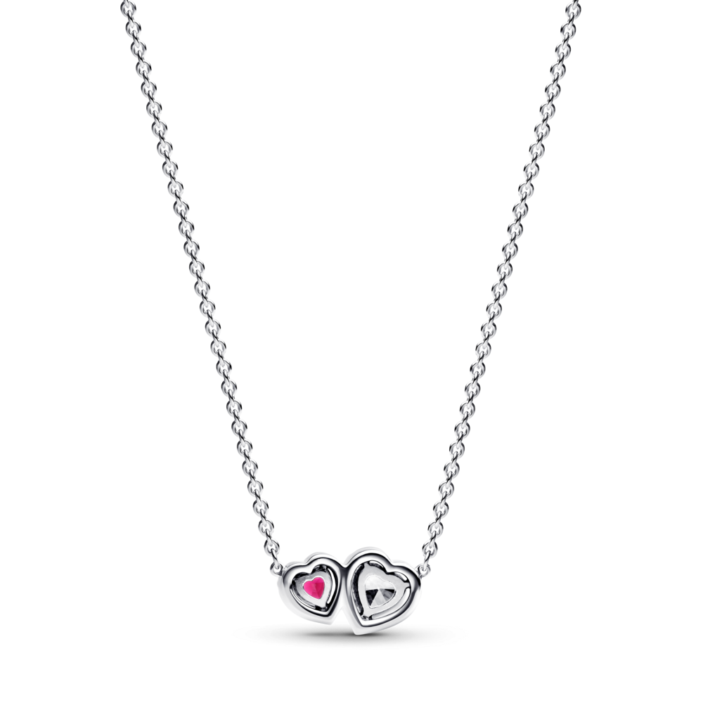 O que o coração deseja. O Colar Pendente Corações Auréola apresenta dois corações ligados que simbolizam o amor profundo. Em prata, esta peça apresenta um cristal man-made vermelho de corte coração e uma zircónia transparente de corte coração, rodeada por pedras pavé brilhantes. Com uma corrente de cabo ajustável (45 cm, 41,5 cm e 38 cm), é perfeita para sobrepor ou usar sozinha para acrescentar um toque de romance ao seu look