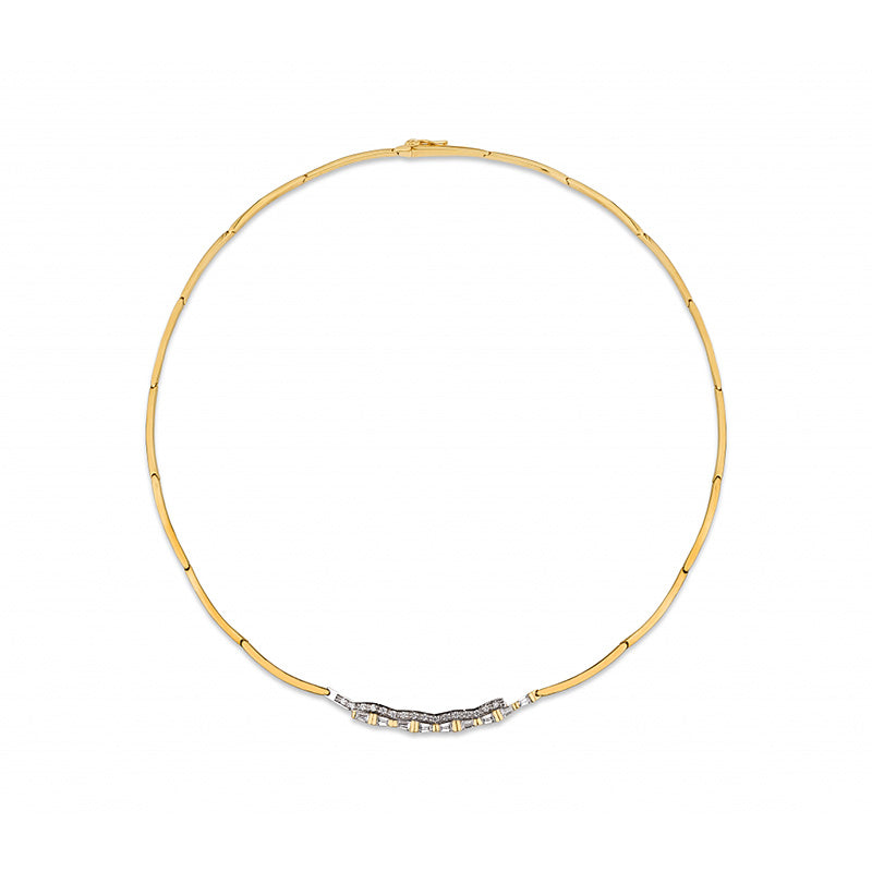 Artigo: Colar Marca: FR Jewels Colecção: Senhora Metal/Toque: Ouro 19.2k, Ouro 9k Pedras: Zircónias Brancas Cor/Metal: Amarelo&Branco Peso apx.*: 11.7g(Ouro 19.2k) Descritivo Pedras: Qtd Tipo Peso (ct) Tam. Cor / Qual. 9 Zirconia branca trap 3x2mm 16 Zirconia branca red 1.30mm Acabamento: Polido * Valores indicativos. Sujeito a variação produção (+/- 5%)