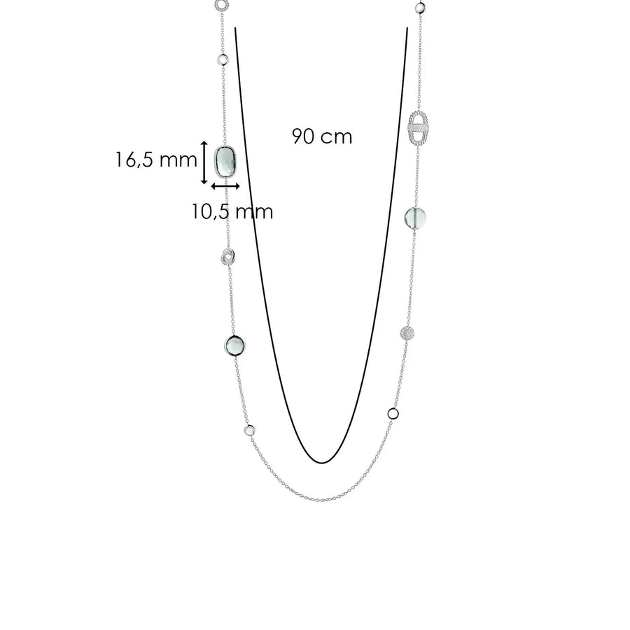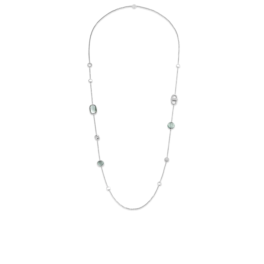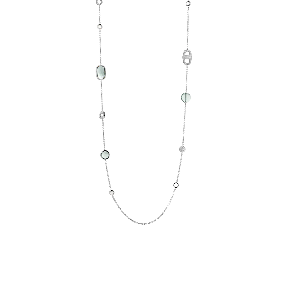 Um mosaico de fichas, formas redondas e retangulares e pedras brancas leitosas estão finamente ligadas pelo brilho da prata neste elegante colar.
