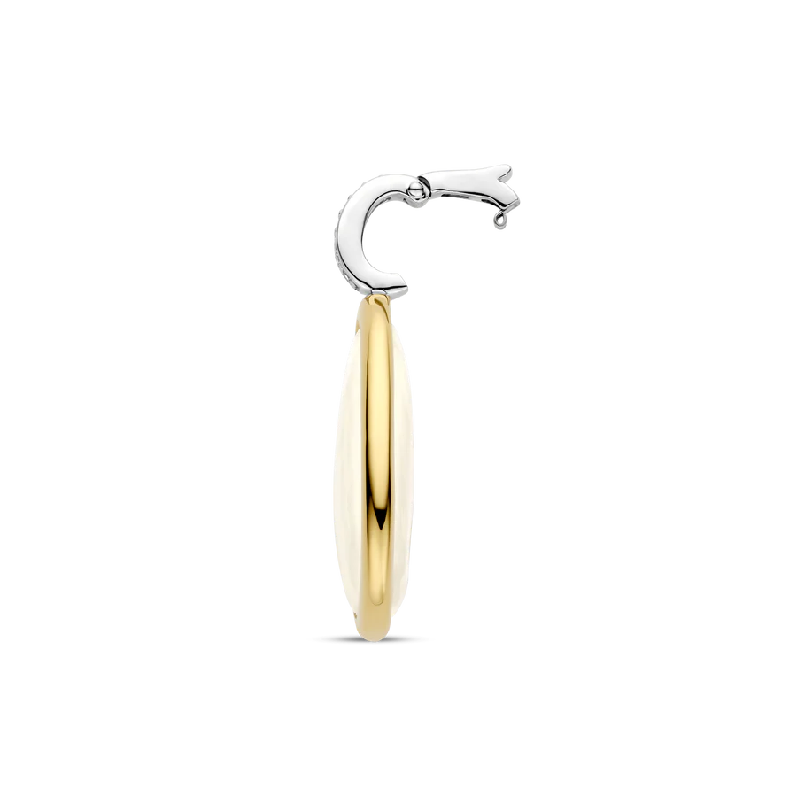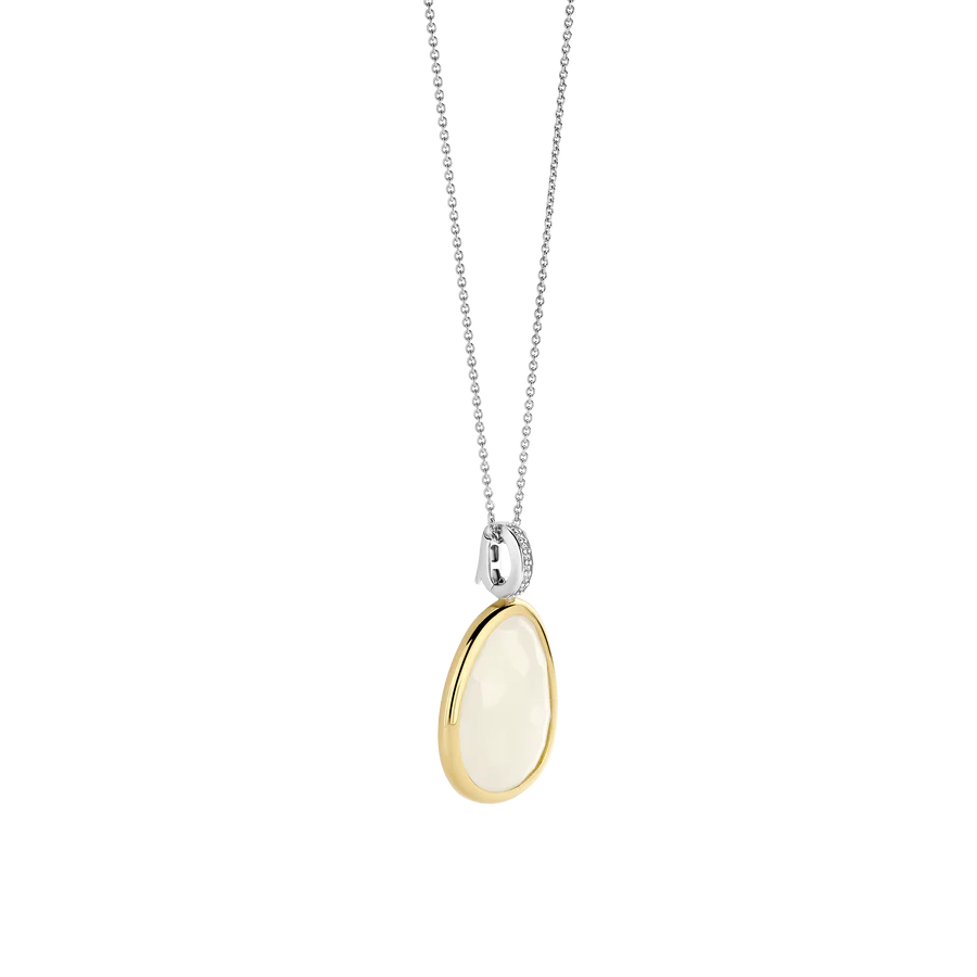 Pingente de prata 6846MW. Uma pedra branca leitosa, com brilho lunar — lapidada à mão em formato de seixo irregular — irradia uma suave luz interna, enquanto sua moldura em ouro amarelo quente emoldura o contorno orgânico com uma riqueza sutil. A gota é presa por uma argola banhada a platina cravejada com zircônias cúbicas de lapidação brilhante, salpicando pontos de brilho que realçam o brilho aveludado da pedra. Flutuando em uma delicada corrente de prata de lei 925, o pingente se acomoda graciosamente na clavícula: marcante o suficiente para ser usado sozinho, mas refinado o bastante para ser combinado com gargantilhas mais curtas, criando um visual leve e personalizado. Livre de níquel e hipoalergênico, proporciona conforto sem esforço dia e noite. O pingente acompanha uma delicada corrente de prata.