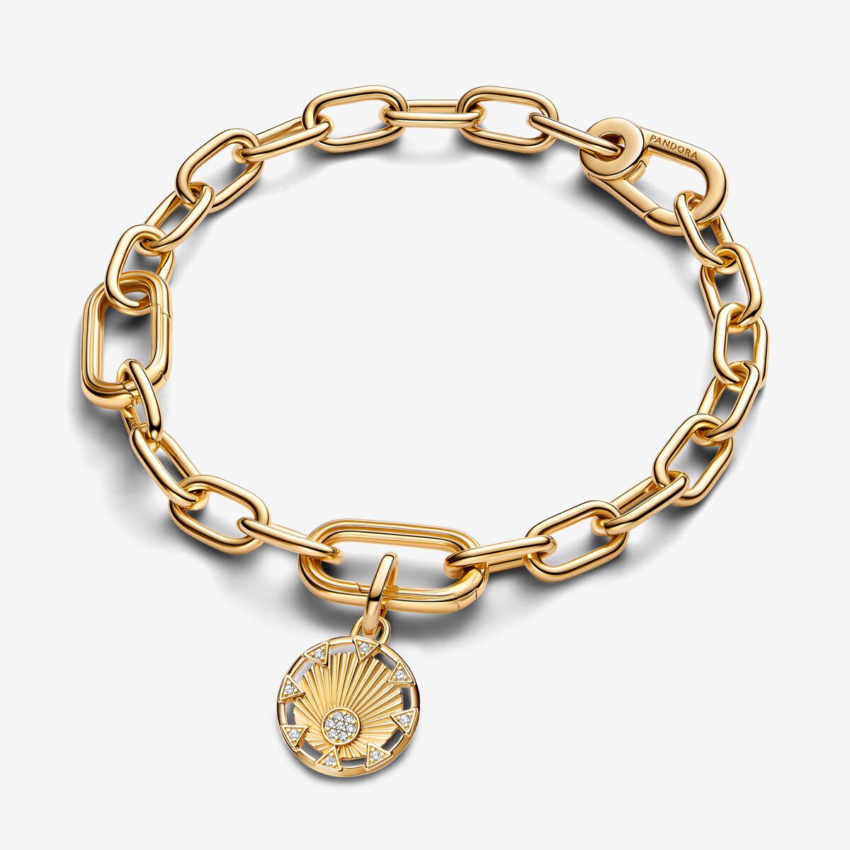Sê toda luz, com a Conta Medalhão Sol Poder da Luz Pandora ME. Esta conta medalhão, com revestimento de ouro 14k, é adornada com pormenores que representam o sol e os seus raios radiantes. Um lado possui pedras cintilantes com cravação pavé no interior do sol e triângulos circundantes; o outro lado apresenta raios de microesferas e triângulos recortados.