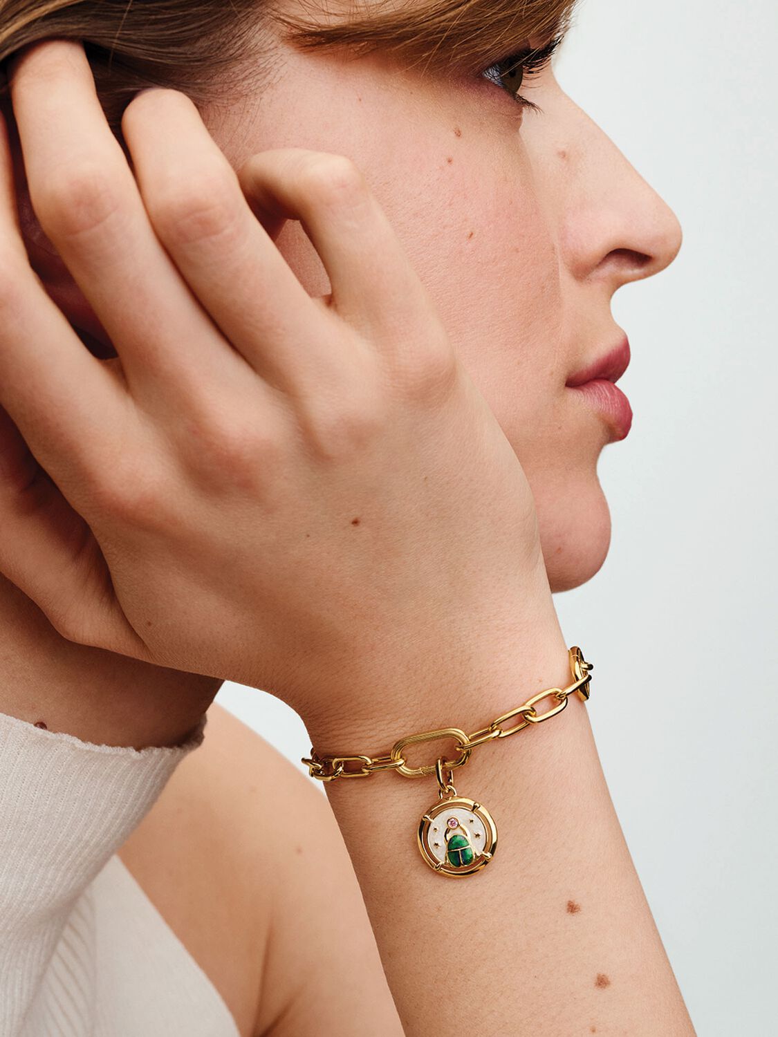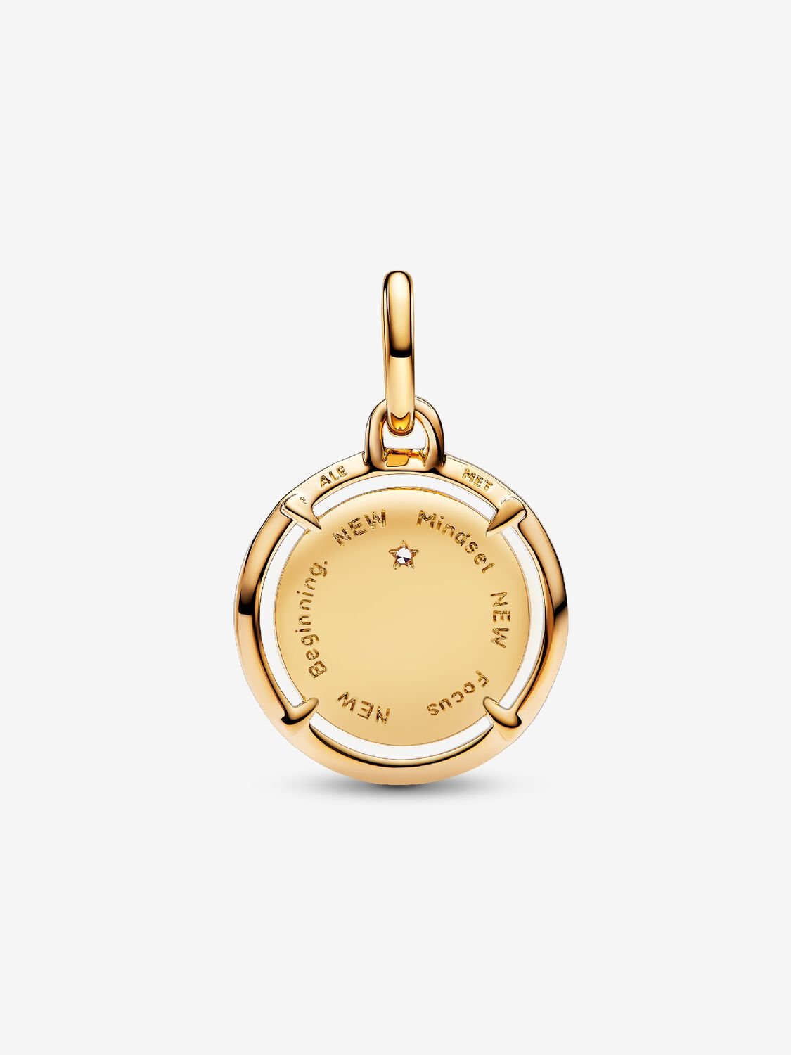 Recomece com esta conta medalhão repleta de significado. Com acabamento em revestimento de ouro 14k, apresenta um motivo simbólico de escaravelho com pormenores de esmalte. Na parte de trás está gravada a mensagem "NEW Mindset NEW Focus NEW Beginning".