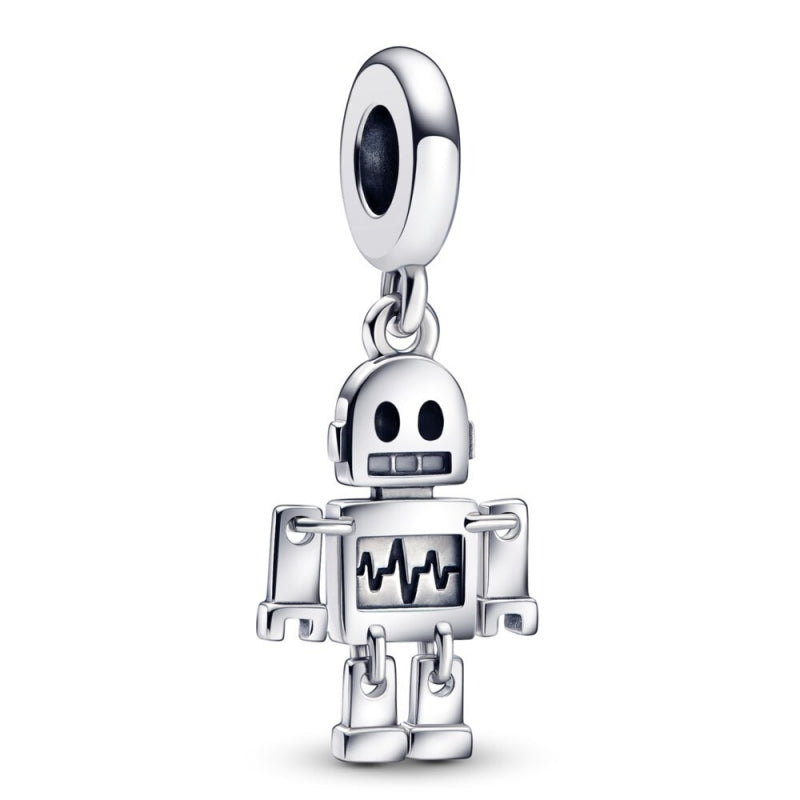 Diga olá a um novo amigo com a Conta Pendente Bestie Bot Robot. Esta minúscula companhia em prata de lei é decorada com esmalte preto e branco, apresentando pernas e braços móveis com dentes quadrados e olhos redondos para uma dose extra de personalidade. A inscrição no tronco indica "A FRIEND IS WHAT THE HEART NEEDS". Use esta conta para se recordar de como as pessoas que ama podem colocar um sorriso no seu rosto e iluminar o seu dia.
