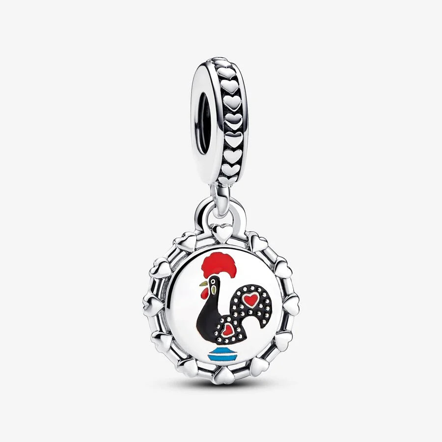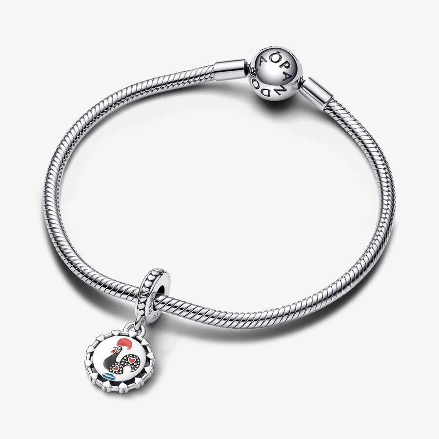 A conta pendente Galo Português apresenta o icónico Galo de Barcelos, simbolizando o espírito de Portugal. Fabricado em prata 925, o disco redondo apresenta um elaborado padrão de rendilhado com delicados corações a rodear o tema do galo e a gravação "PORTUGAL" do outro lado. O detalhe do esmalte dá vida ao galo, enquanto a fila de corações em relevo na argola acrescenta um toque especial. Perfeita para qualquer pulseira ou outro porta contas, esta peça reflecte o significado cultural e as memórias das férias. Combine-a com outras contas em prata 925 para criar um estilo especial e memorável.