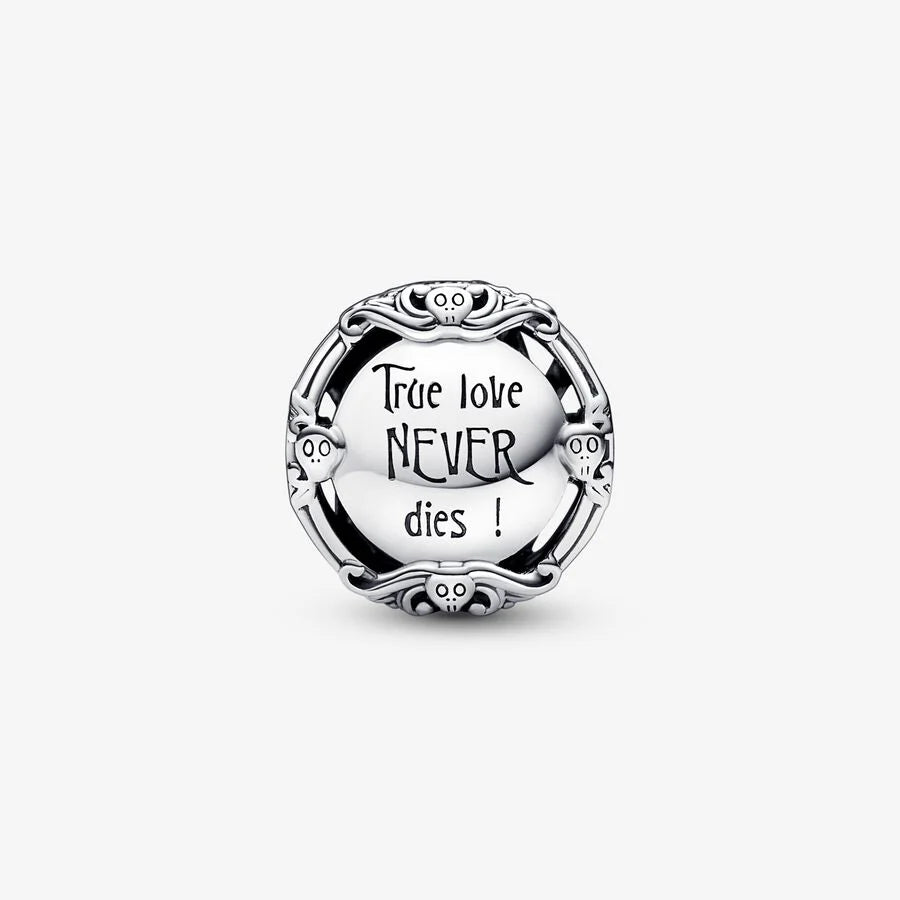 Feliz Halloween! Celebre a estação mais assustadora do ano com uma conta especial inspirada em The Nightmare Before Christmas de Tim Burton da Disney. Com acabamento manual em prata 925, apresenta Sally e Jack Skellington de um lado e a inscrição "True love NEVER dies" em letra gótica do outro. Adicione o rei e a rainha do Halloween ao seu suporte de contas preferido e celebre o amor que nunca morre.