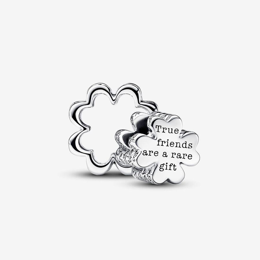 Duplique a sua sorte com a Conta Trevo de Quatro Folhas Divisível. Esta conta de prata, com quatro folhas em forma de trevo, encerra mais do que se vê à primeira vista, já que o trevo interior pode ser separado da concha exterior e usado como uma conta separada, o que a torna a peça ideal para oferecer a alguém próximo que necessite de um pouco mais de sorte. O trevo interior apresenta a inscrição "True friends are a rare gift" atrás e "Lucky to have you" de lado, folhas em forma de coração e cristais man-made verdes em dois tons diferentes.