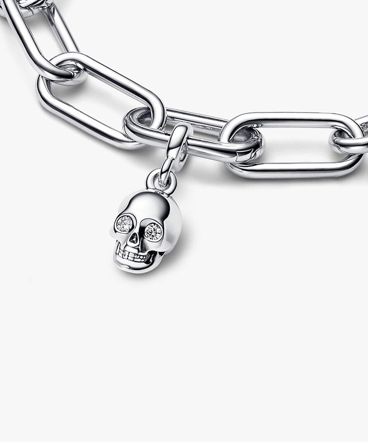 Vive a vida ao máximo com o nosso Mini Pendente Skull Pandora ME. Em prata pura, o mini pendente apresenta dois olhos de zircónias de corte brilhante e pormenores realistas no nariz e nos dentes que mostram que a morte está nos detalhes. Conferindo um toque de leveza à colecção, o seu significado não é negro ou directo, tendo sido inspirado no emoji que envias quando estás a dar gargalhadas. Para te lembrares de que não deves levar a vida demasiado a sério, conjuga-o em styling connectors de abrir nas tuas pulseiras, colares, anéis e argolas de corrente de elos Pandora ME. Estilizar, ou não estilizar - essa é a questão...