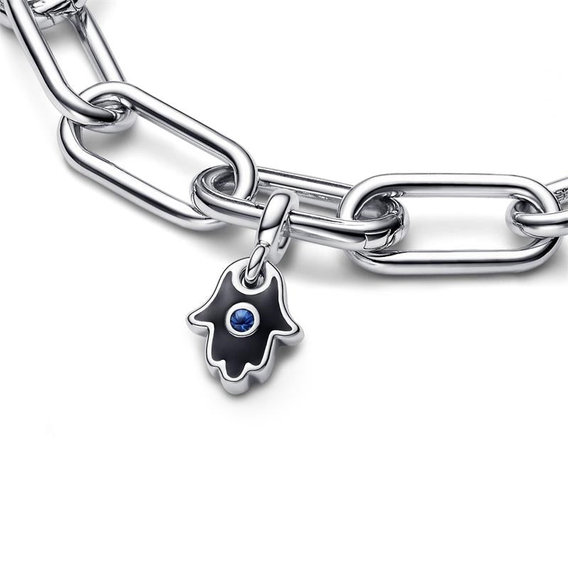 O nosso Mini Pendente Hamsa Hand Pandora ME é fabricado em prata com pormenores de esmalte preto. Esta peça repleta de significado pende para baixo, inspirada nos símbolos de protecção. Com um cristal man-made de cravação em aro, usa-a para te lembrares de dar as boas-vindas à doçura, à bondade e à graça na tua vida. Conjuga-o nas tuas pulseiras, colares, anéis e argolas de elos Pandora ME.