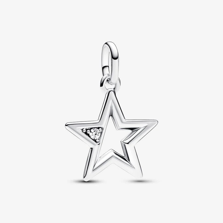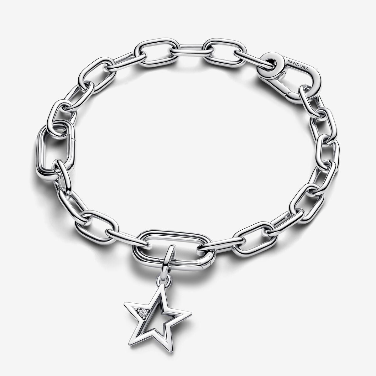 As estrelas estarão sempre alinhadas quando usares a Conta Medalhão Estrela Cintilante Pandora ME. Com perfil em forma de prisma, esta conta estrela de prata inclui uma pedra cintilante cravada à mão numa das suas cinco pontas. O lado inverso apresenta microesferas, uma linha elevada e um orifício em forma de triângulo na cravação, através do qual a pedra é visível.