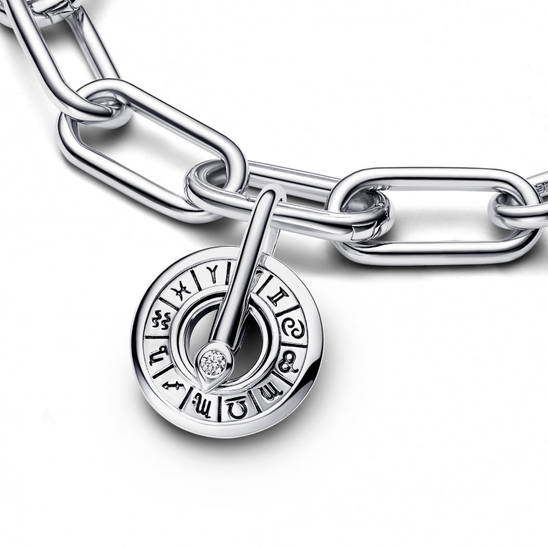 Abraça o teu signo solar, usando a Conta Medalhão Roda do Zodíaco Pandora ME. Com símbolos gravados dos 12 signos do Zodíaco, esta conta de prata tem a capacidade de rodar. A união apresenta um pendente em forma de gota com uma pedra cintilante, enquanto o lado inverso da conta contém um círculo de microesferas. Com pormenores intrincados e funcionalidades interessantes, esta conta medalhão do Zodíaco permite rodar o mostrador sempre que quiseres alinhar o teu estado de espírito ou o teu look. Compatível com Pandora ME e Pandora Moments.
