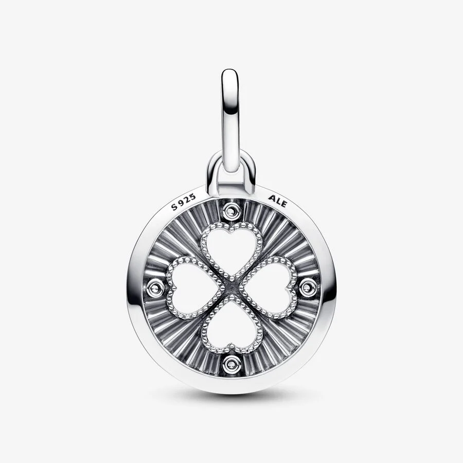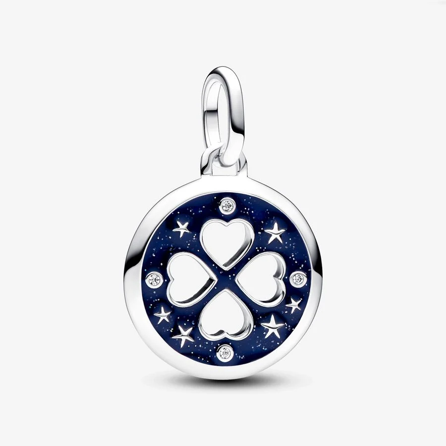 Cria a tua própria sorte com a Conta Medalhão da Sorte Pandora ME em prata. Este amuleto moderno irradia amor e sorte, com quatro corações recortados a formar um trevo de quatro folhas, rodeado por esmalte azul profundo brilhante, pedras transparentes e estrelas elevadas. O lado inverso é detalhado com linhas ranhuradas e microesferas. Esta conta medalhão pode ser conjugada em suportes de contas Pandora Moments e elos de abrir em suportes Pandora ME.