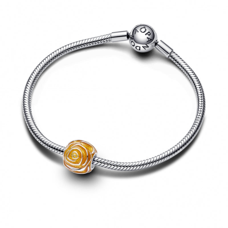 Em prata, Conta Rosa em Flor Amarela representa a beleza dos botões em flor. O design simbólico apresenta uma rosa em flor, adornada com esmalte amarelo brilhante transparente aplicado manualmente. As pétalas em camadas criam um efeito tridimensional, revelando prata por baixo do esmalte exterior. Inspirada no simbolismo das rosas amarelas, representando alegria, amizade e novos recomeços, a conta é uma expressão tangível do amor. Ofereça uma peça de beleza eterna e emoção sincera com esta conta detalhada Pandora Moments.