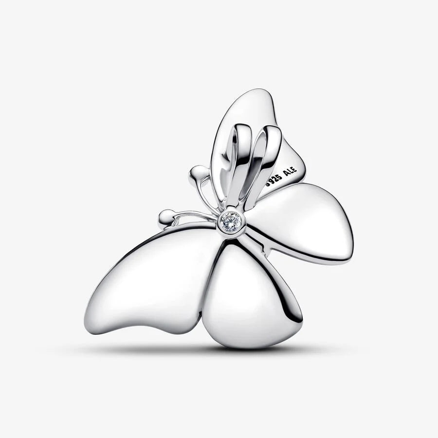 Esta conta de prata sobredimensionada capta a beleza e a graça de uma borboleta verdadeira, como se tivesse pousado por um momento na sua joalharia. O esmalte iridescente nas asas cria um efeito de cor vibrante que muda com a luz. Pedras cintilantes conferem um remate final ao corpo e às antenas. Use esta peça marcante como símbolo da jornada transformadora da borboleta, inspirando-nos a abraçar a mudança e o crescimento.